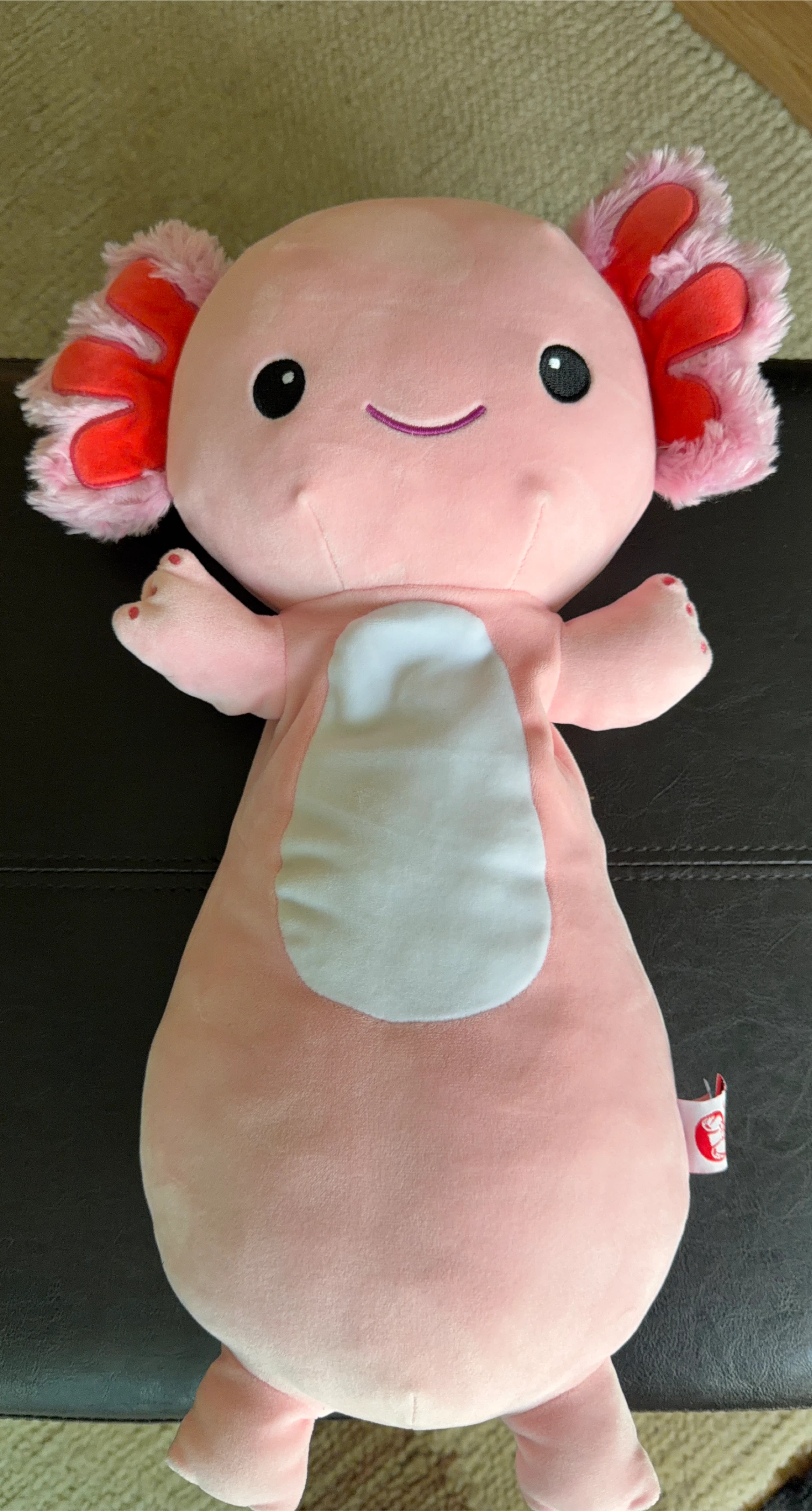 262A cute and cuddly pink axolotl plush toy! It has a white belly and red gills. Perfect for kids or anyone who loves axolotls