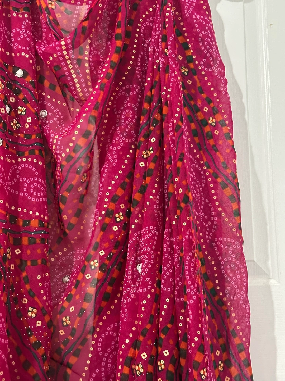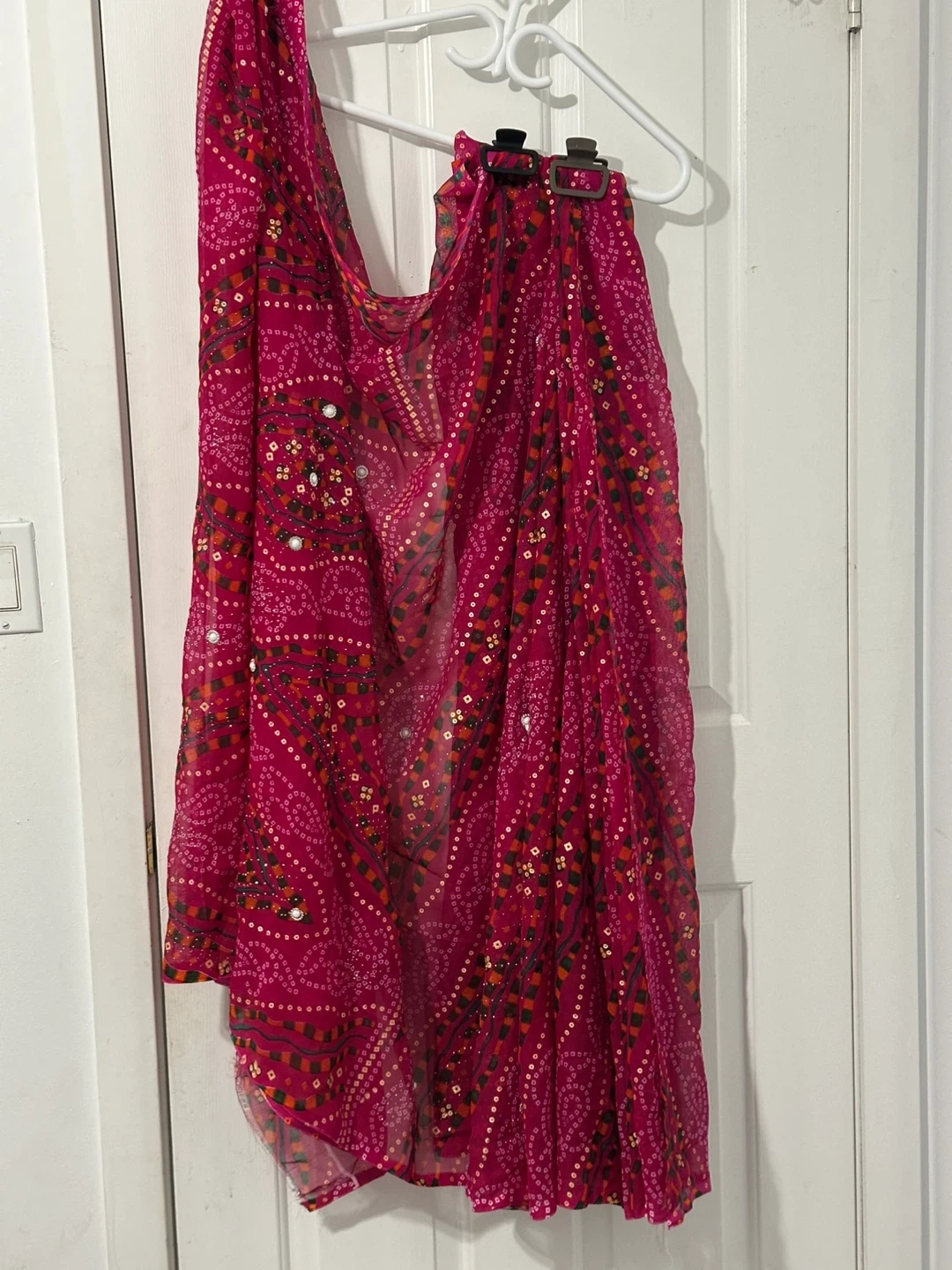 28Selling a beautiful pink bandhani saree! It comes with a matching blouse piece. The saree features a traditional dotted pattern with accents of orange and green. Perfect for festive occasions or cultural events!