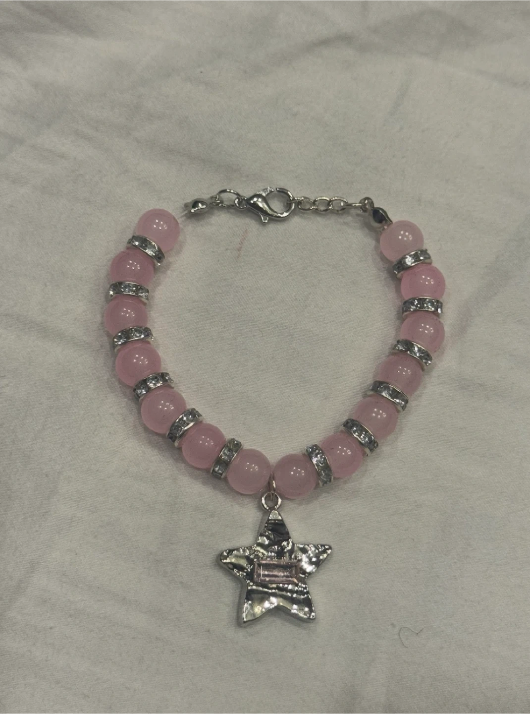 15This is a cute pink beaded bracelet with a star charm. It's in great condition and would be a lovely addition to any outfit!