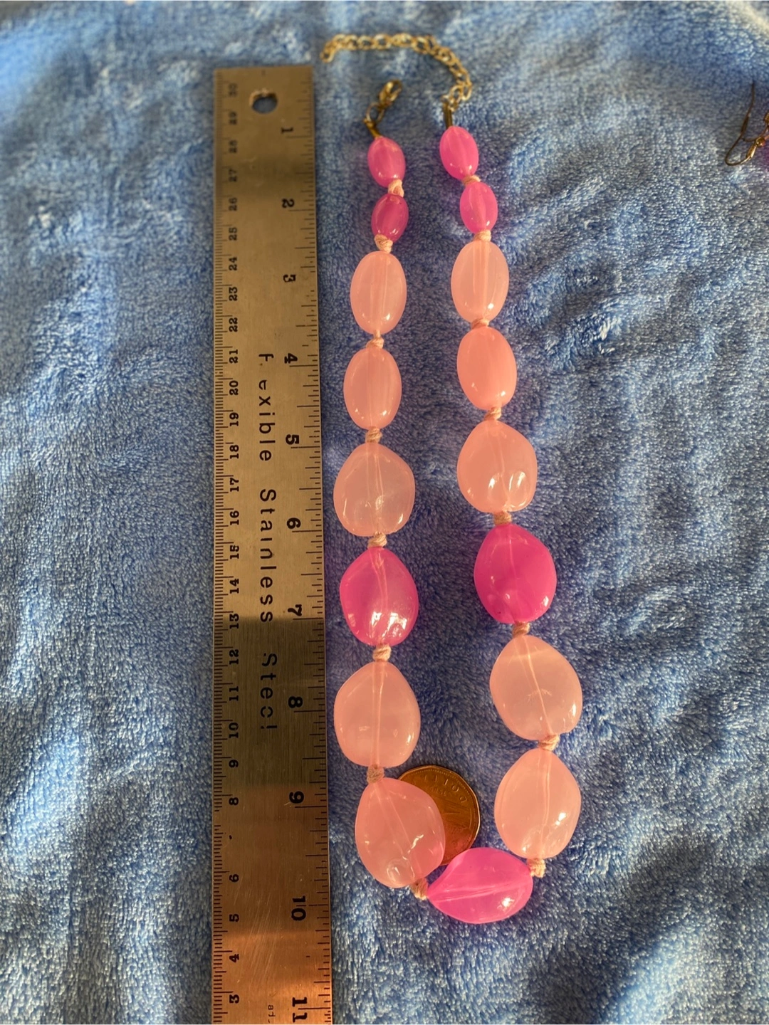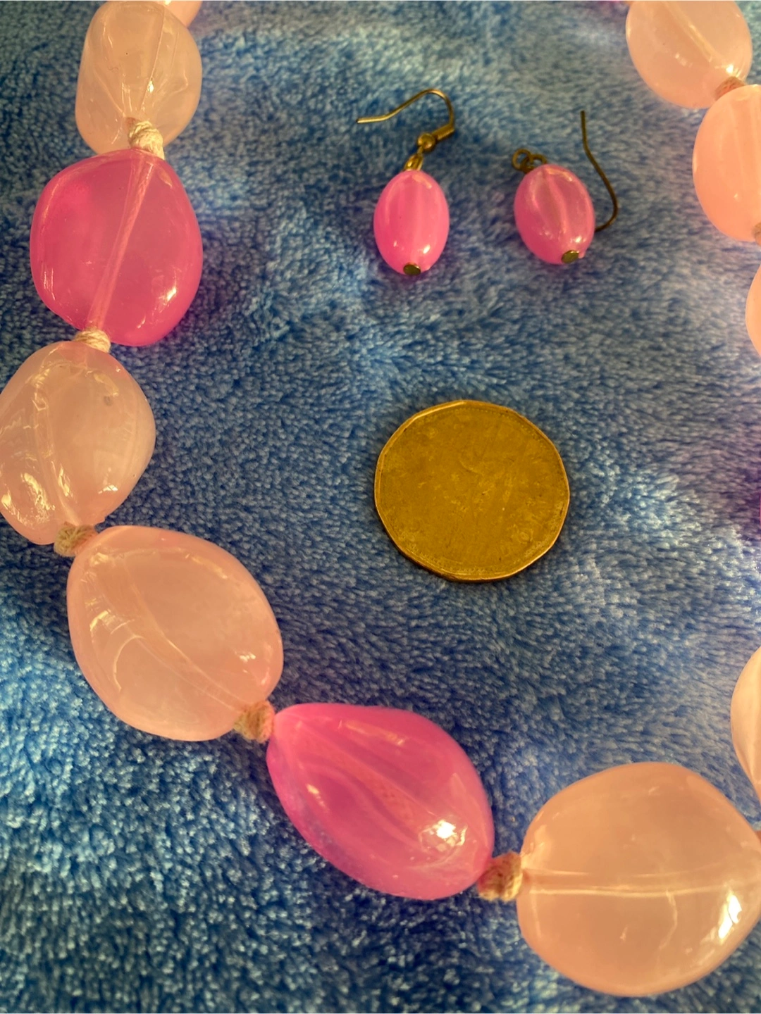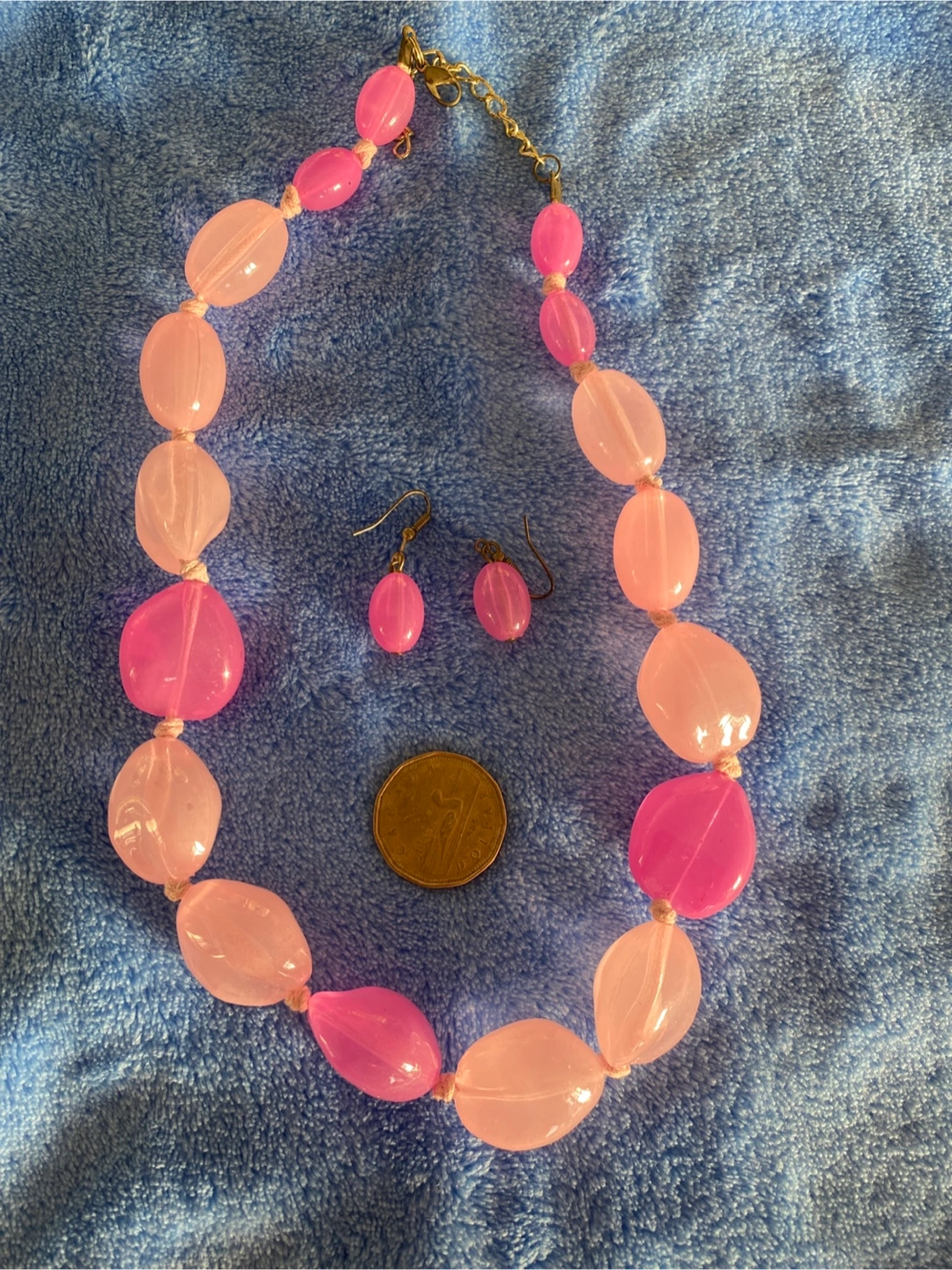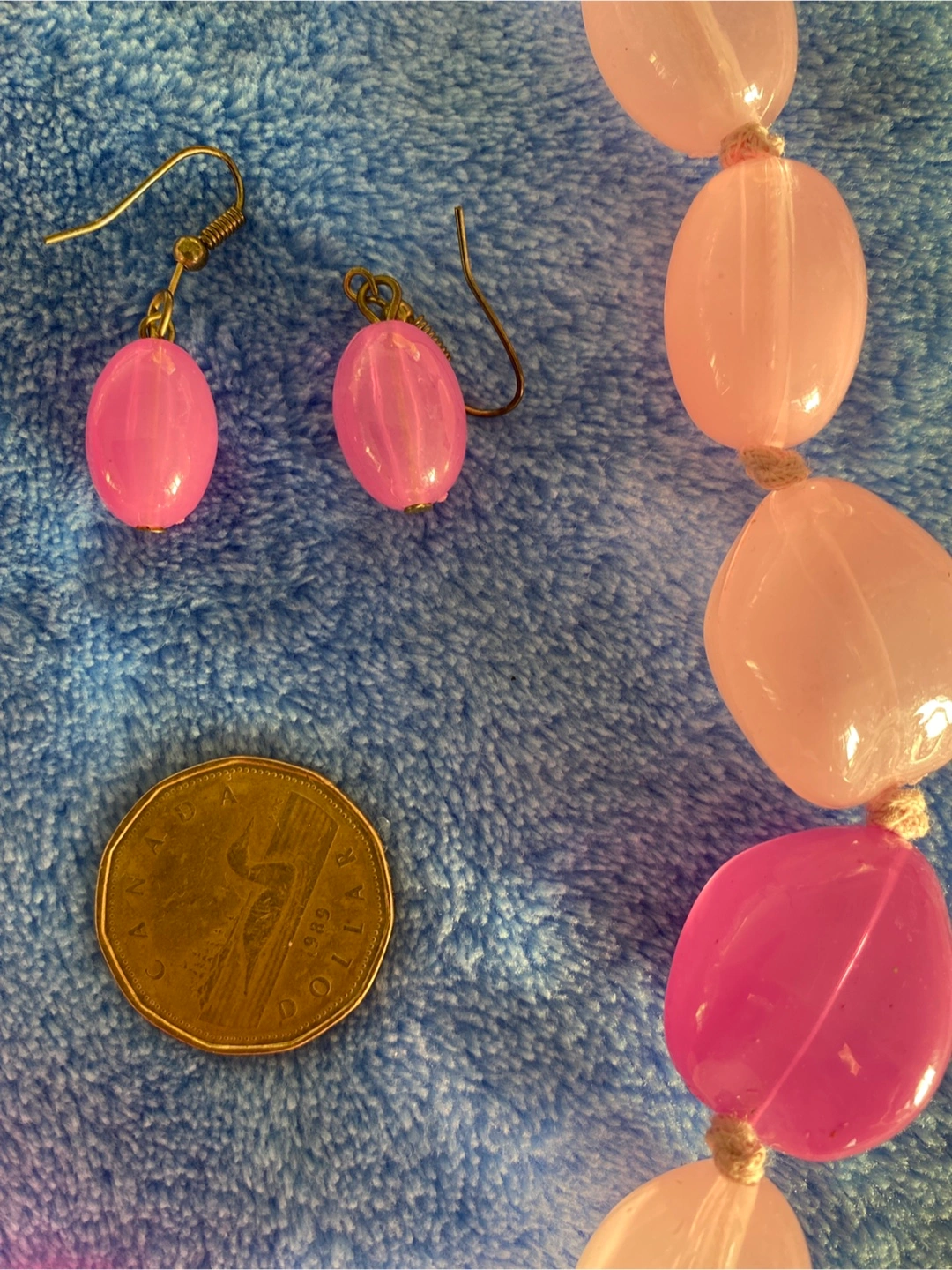 Here's a cute set featuring a pink beaded necklace and matching earrings! The necklace has a mix of light and dark pink beads, and the earrings are a simple drop style. In very good condition-see the pictures pls. Pick up at Yonge and Bloor