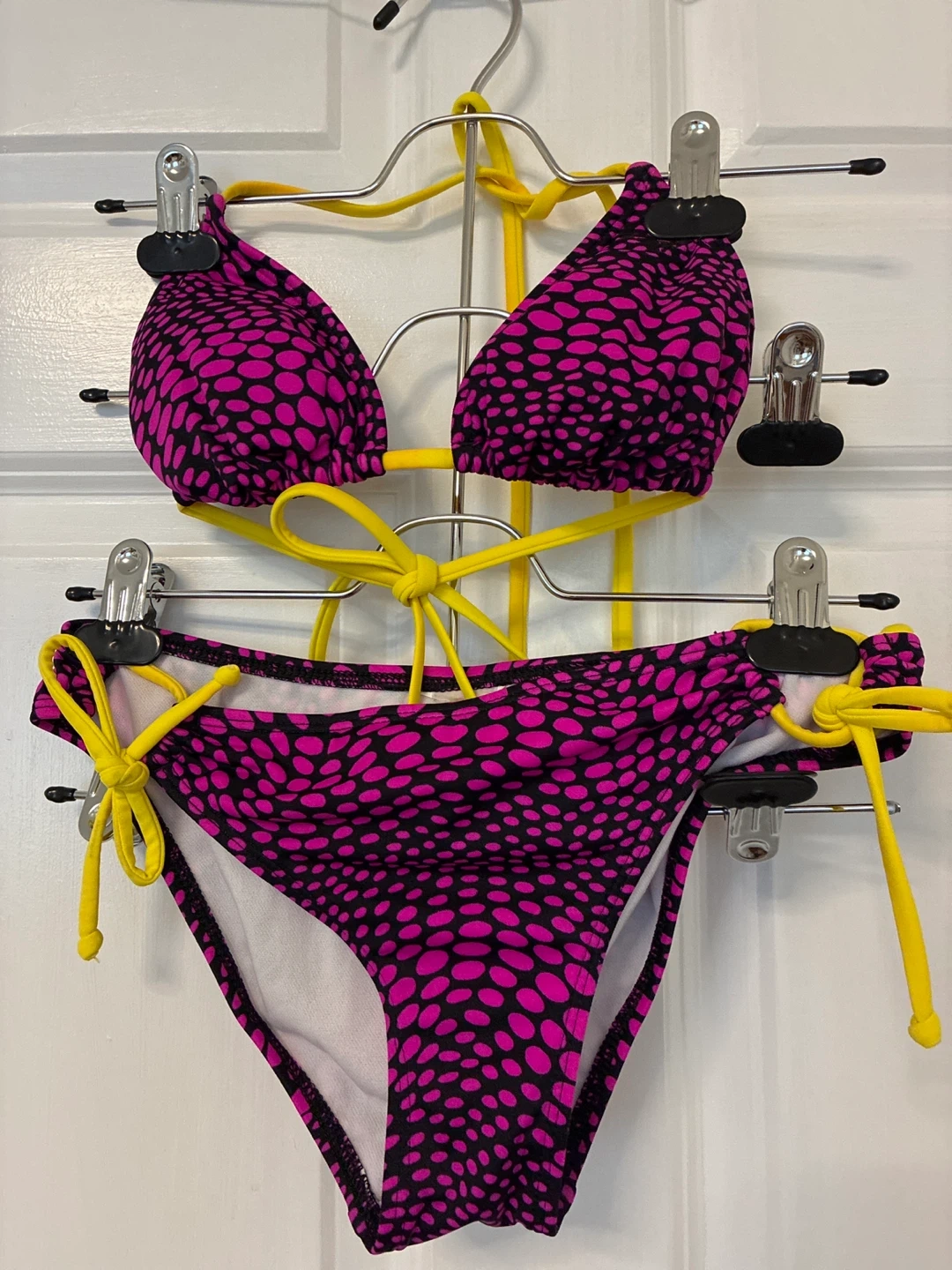 118Selling a cute bikini set in pink and black! It features a fun, eye-catching pattern and bright yellow ties. Perfect for summer days at the beach or pool!