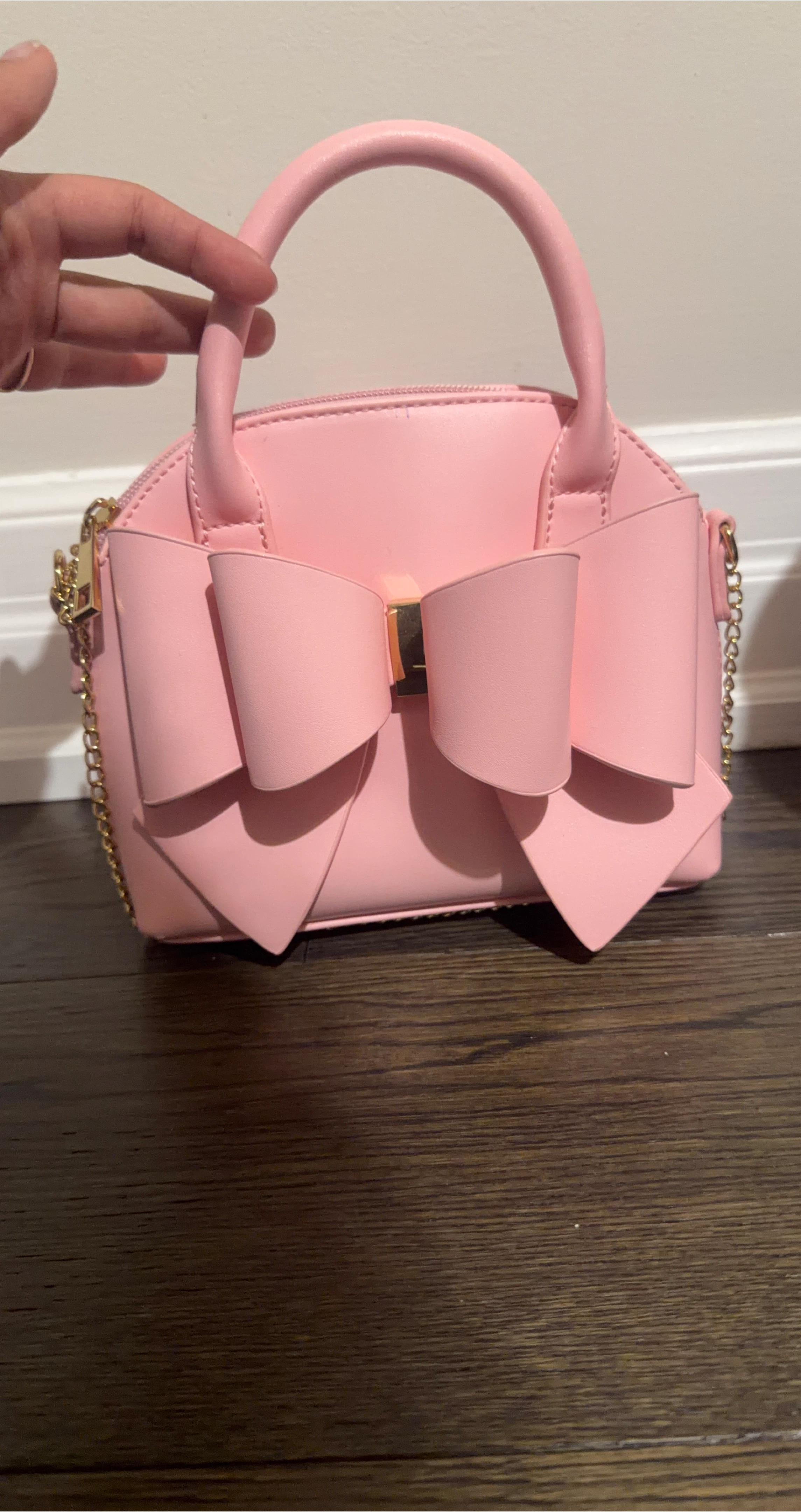 10This is a cute pink handbag with a bow detail! It has a handle and a gold chain.
