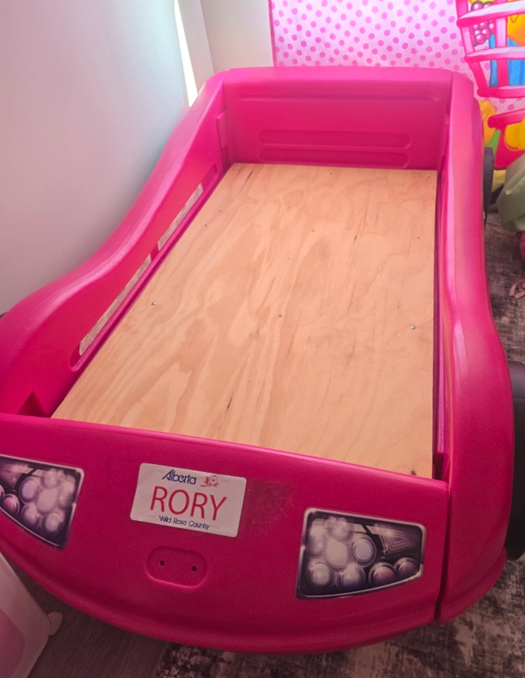 Selling a cute pink car-shaped toddler bed! It's in great condition and ready for a new home. Perfect for transitioning your little one to their first big bed. It's a fun and playful design that any kiddo would love