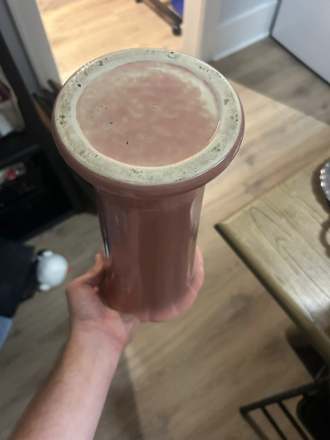This is a lovely pink vase that would look great in any room! It stands approximately 13 inches tall and features a unique design with a light blue interior. It's a perfect piece for displaying flowers or as a standalone decorative item