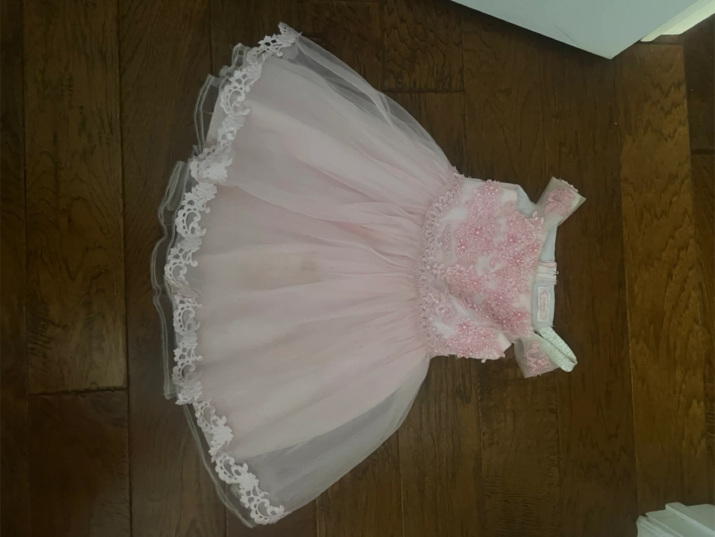 A sweet pink dress, perfect for a special occasion! It features delicate lace detailing and a soft, flowing skirt. The bodice has lovely embellishments. A charming addition to any little one's wardrobe!