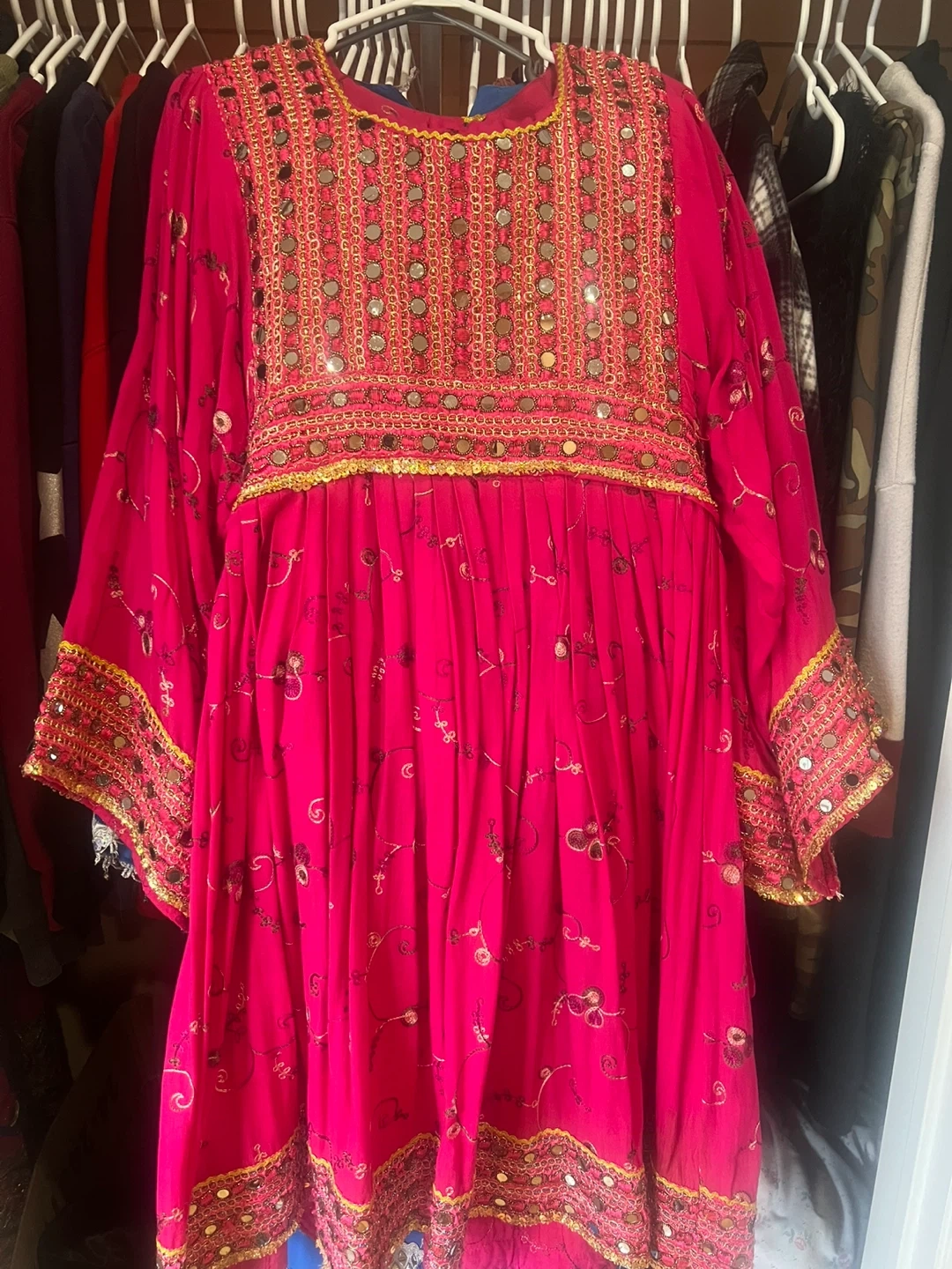 A beautiful pink dress with gold embroidery and mirror detailing. It's in great condition and would be perfect for a special occasion or just to add a pop of colour to your wardrobe! The fabric is lightweight and comfortable, making it ideal for warmer weather