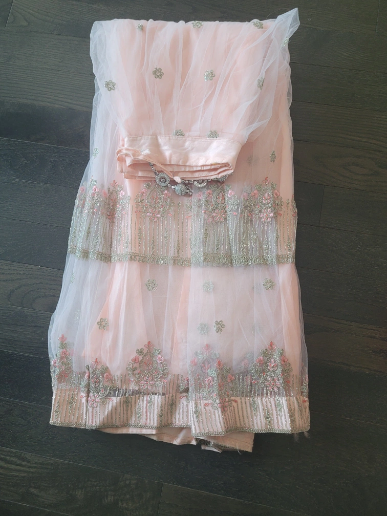 Beautiful pink lehenga choli set with delicate embroidery. Perfect for a special occasion! The set includes the top (choli), skirt (lehenga), and a matching dupatta.