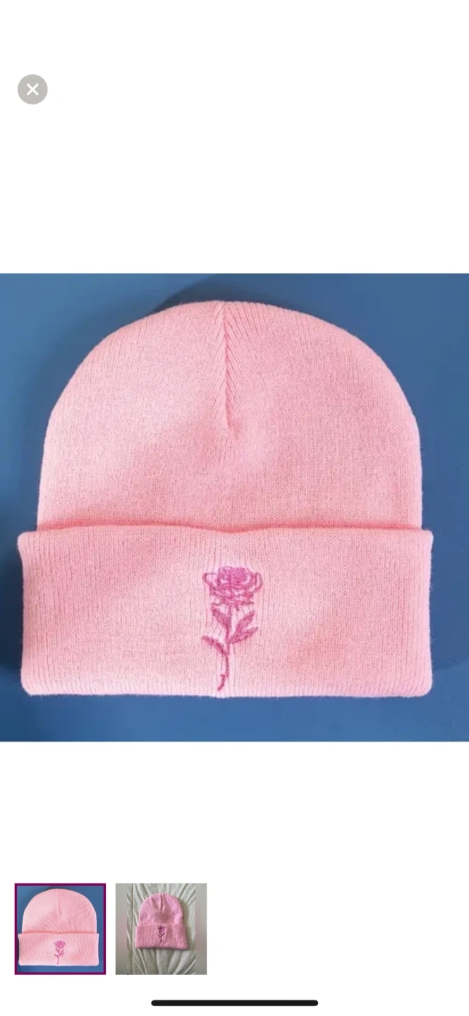 954Cute pink beanie with an embroidered rose design! It's in great condition and ready to keep you warm on chilly days