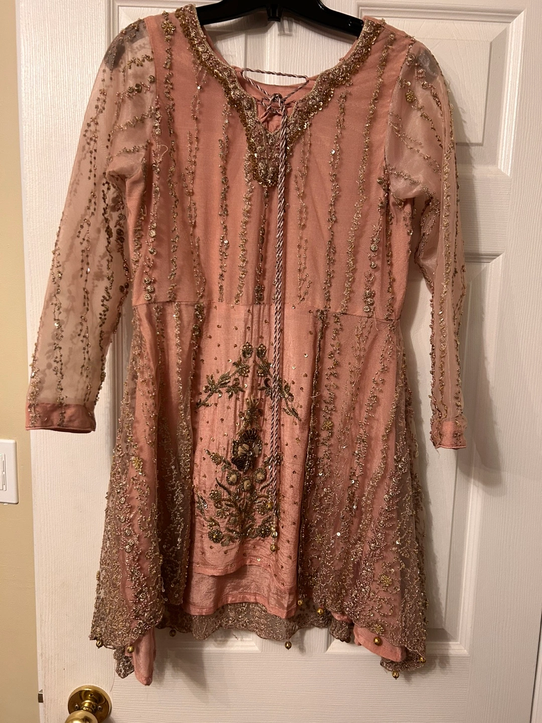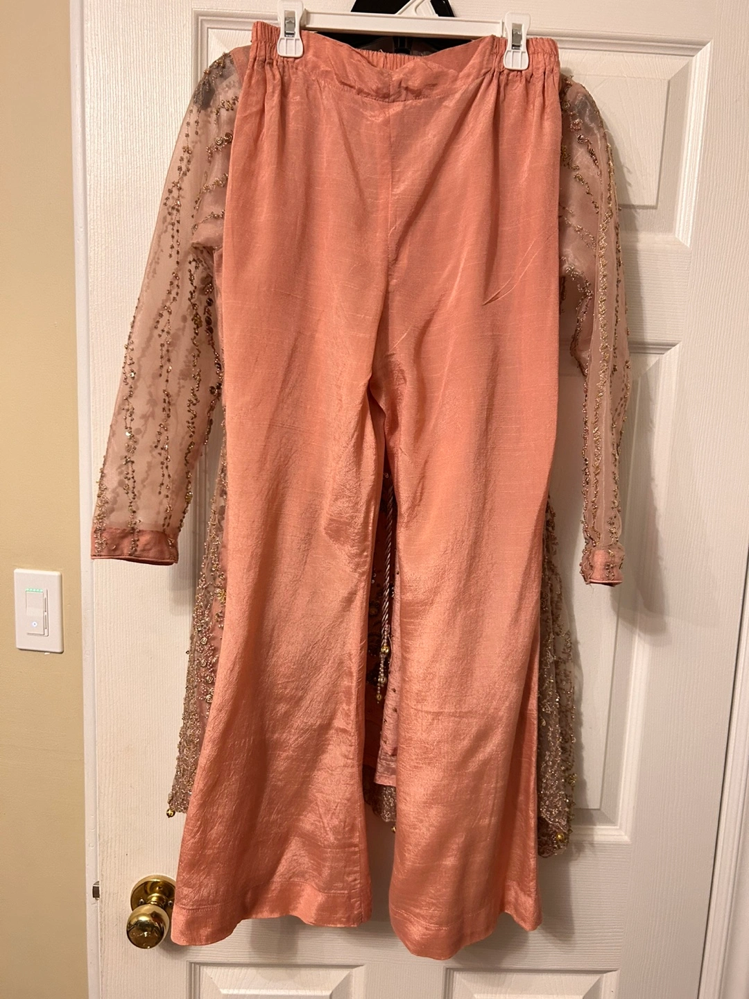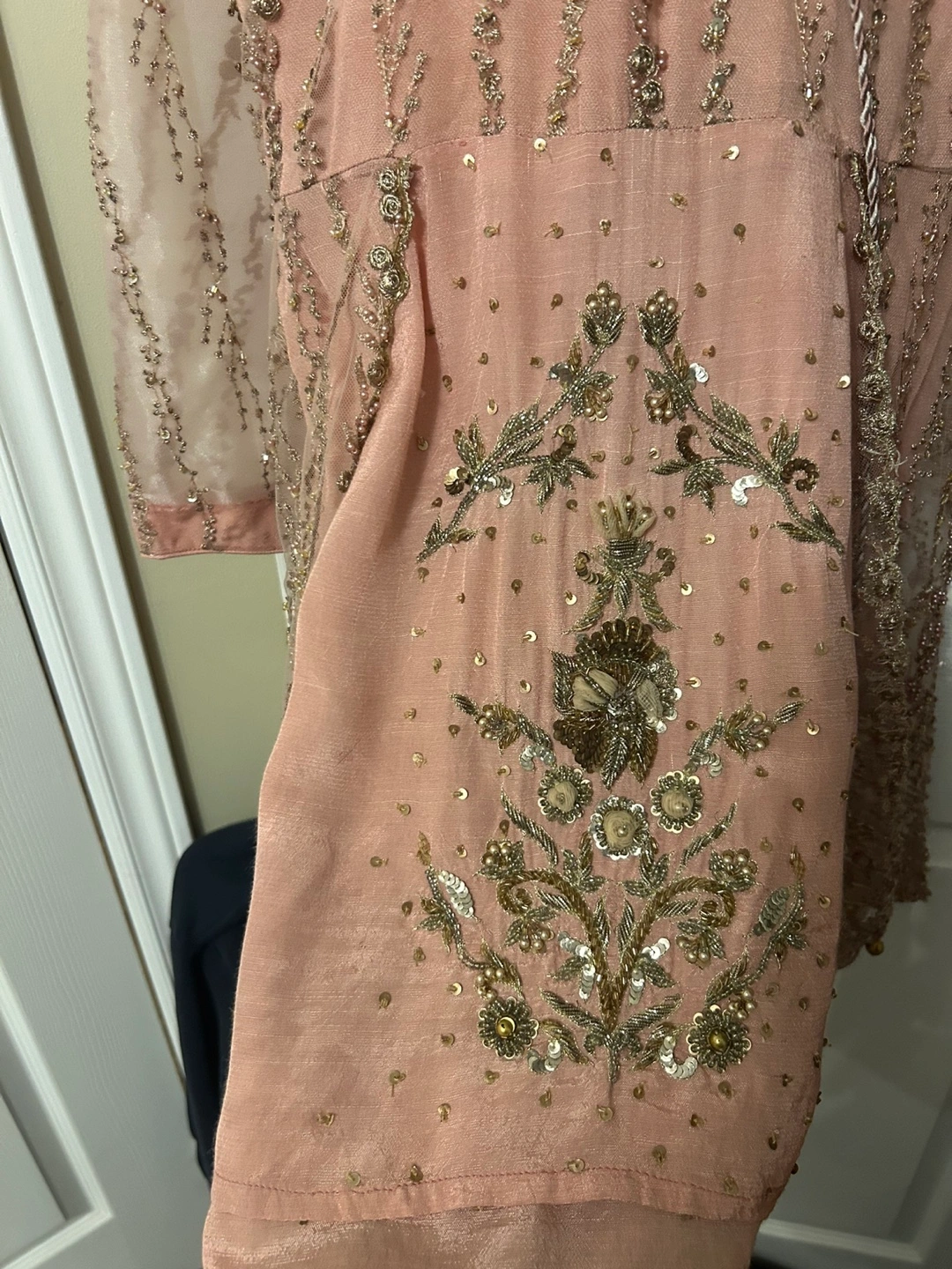 Selling a beautiful pink peplum style kameez with flared pants. It's in good condition and perfect for a special occasion! The fabric has a lovely shimmer with intricate embroidery details on neck and daman. Pick up in Burlington
