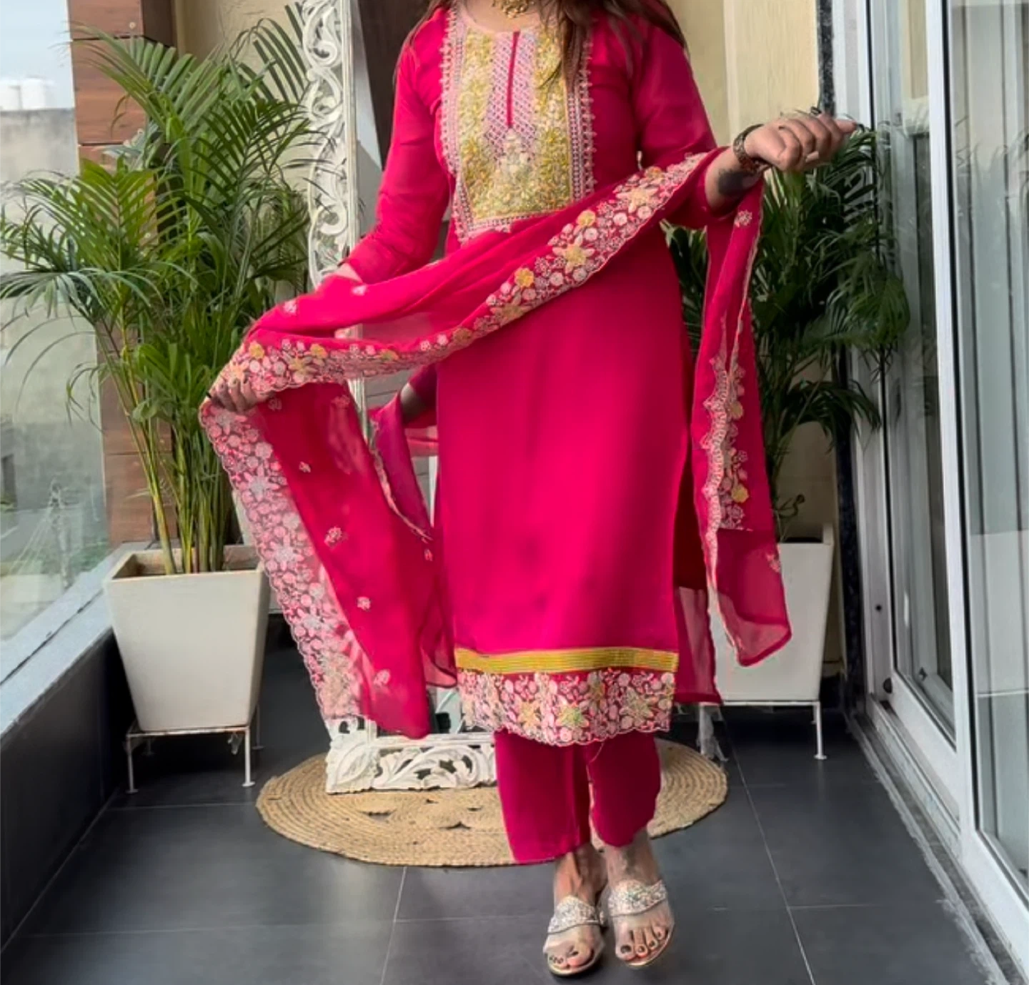 Beautiful pink salwar kameez with intricate embroidery. Perfect for a special occasion or just feeling fancy! Price - $75
