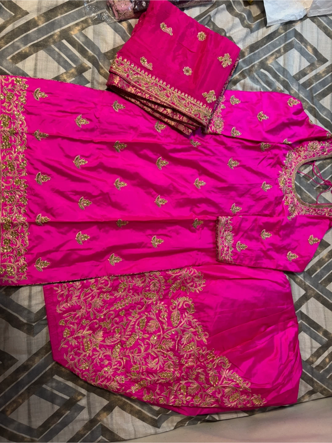 10Beautiful pink bridal salwar kameez suit with gold embroidery. The suit includes the top, bottom, and dupatta.