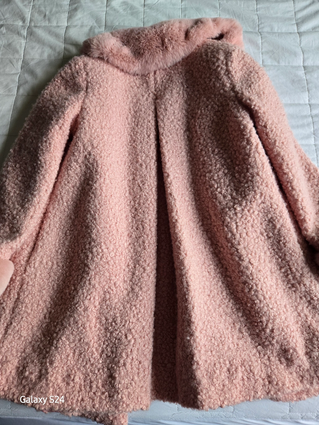 10Adorable pink child's coat. Features a fluffy faux fur collar and cuffs. Button closure. A-line silhouette. Excellent for colder weather.