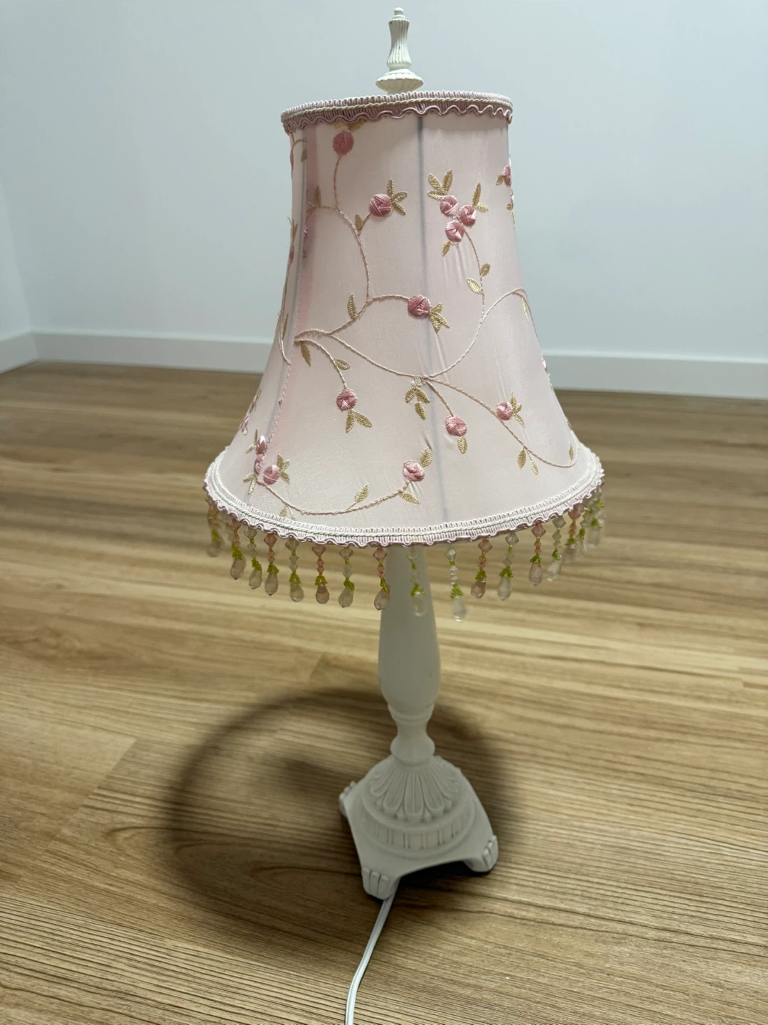 Selling a charming pink table lamp with a delicate floral design. It features a white base and a lovely beaded trim along the shade. This lamp would add a touch of whimsy to any room!