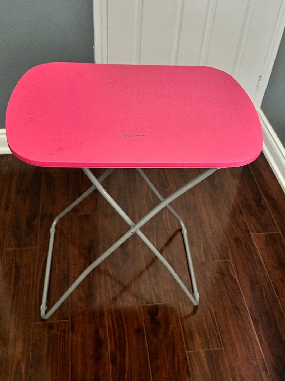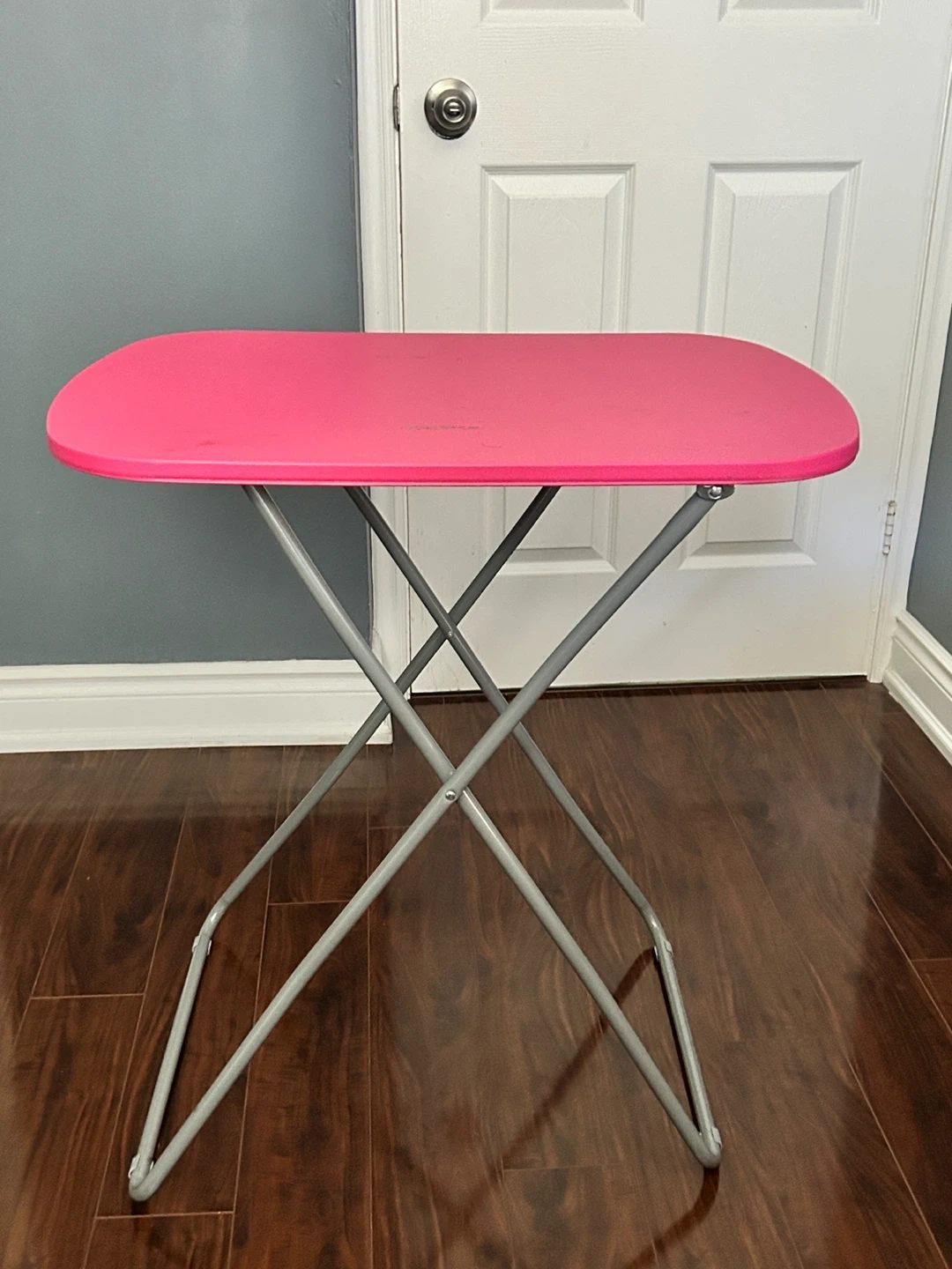 68Model:NT5575, weight limit of 52 lb Here's a cute pink folding table! It's perfect for small spaces or for when you need an extra surface. The legs fold easily for storage, making it super convenient. It's in good condition and ready for a new home.