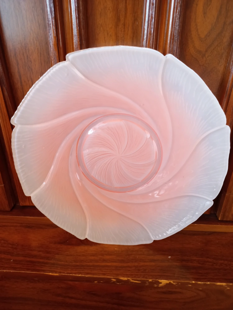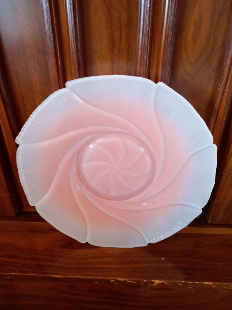 Beautiful pink frosted glass platter. it fe kiatures a unique swirling design and a soft, elegant look. Perfect as a decorative piece or for serving! It would look great on a table or shelf