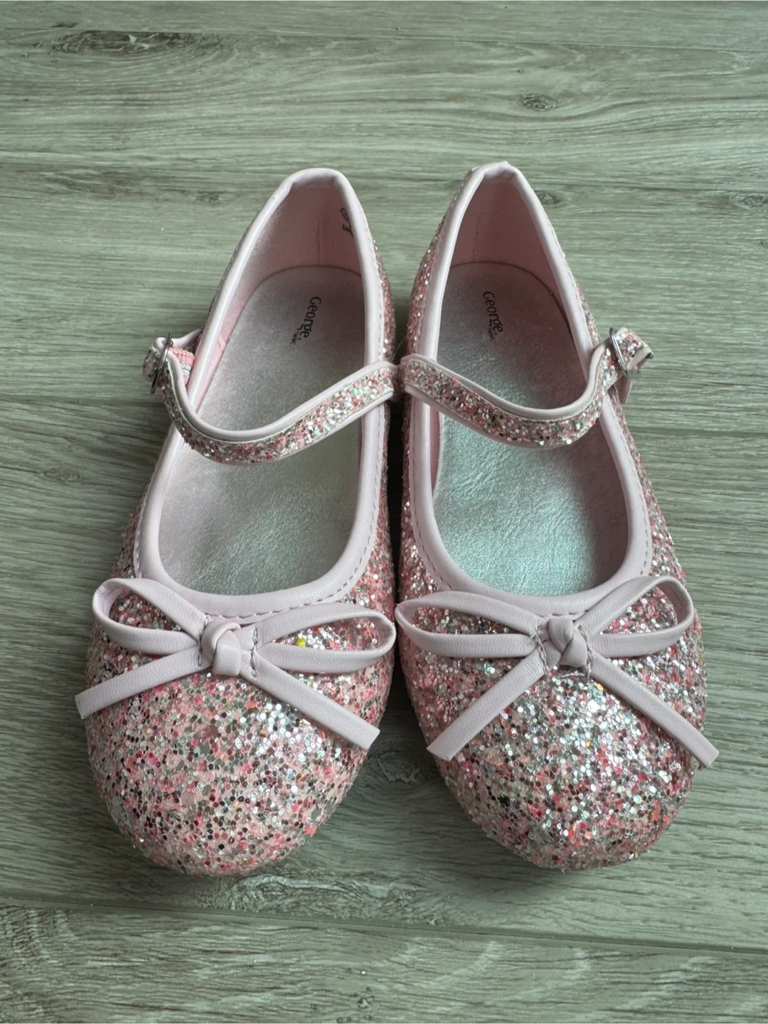 10These adorable ballet flats are perfect for your little one! They're a pretty pink colour and covered in glitter, with a cute bow detail. Like new condition! Worn once only at the cruise dinner last year. The size is 12.