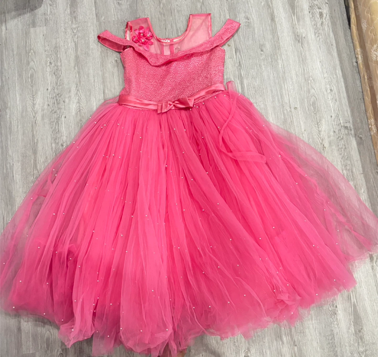 A beautiful pink dress, perfect for parties or special occasions! It features a sparkly bodice, a tulle skirt with pearl accents, and a cute bow at the waist. It is in great condition. Size 38
