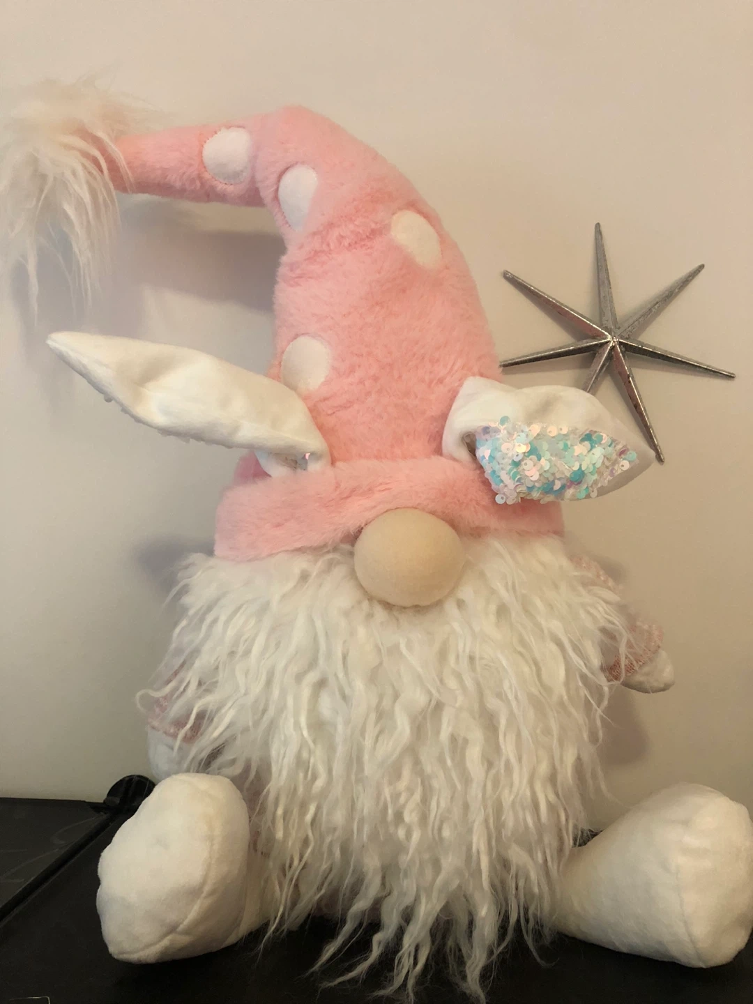 408Cute pink gnome decoration! It has a fluffy white beard and a pink hat with white polka dots. Perfect for adding a touch of whimsy to your home decor