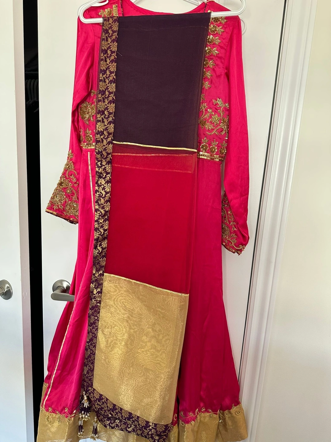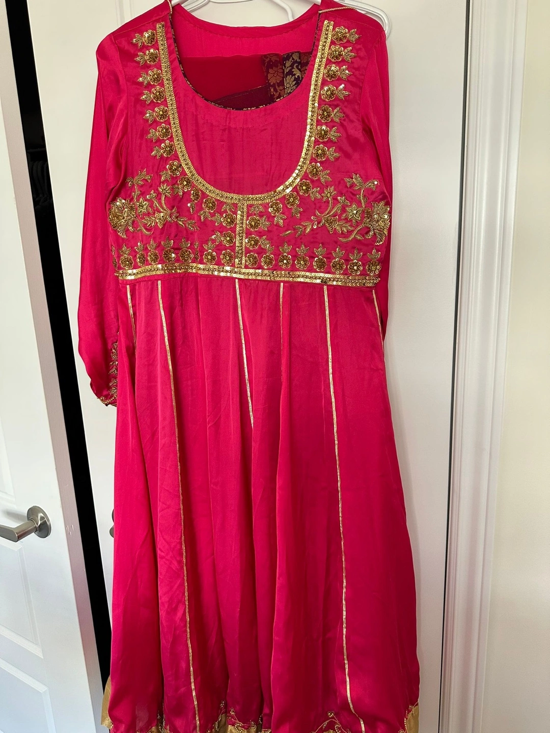 60Beautiful pink Anarkali dress with gold embroidery! Perfect for special occasions or cultural events. The dress features intricate detailing and a flattering silhouette. It's in great condition and ready for a new home! brand new never worn size not right its silk fabric chest 19.5 length 49