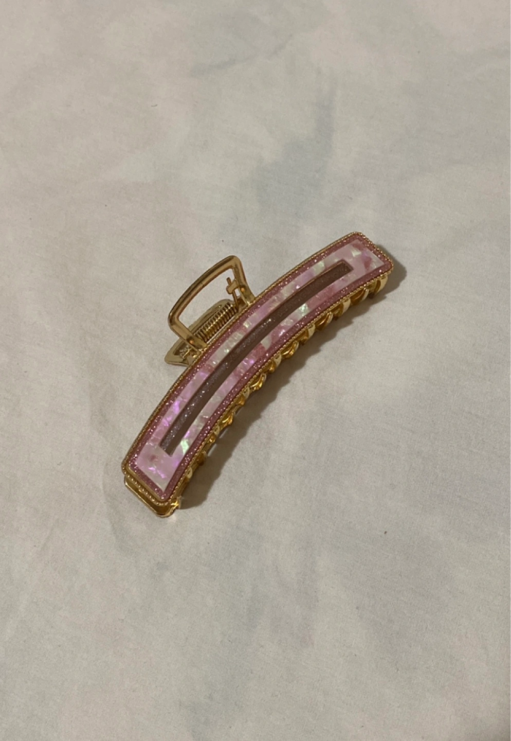 Selling a cute hair claw clip! It features a rectangular design with pink and gold detailing. Perfect for adding a touch of sparkle to your hairstyle. Pick up and cash only!