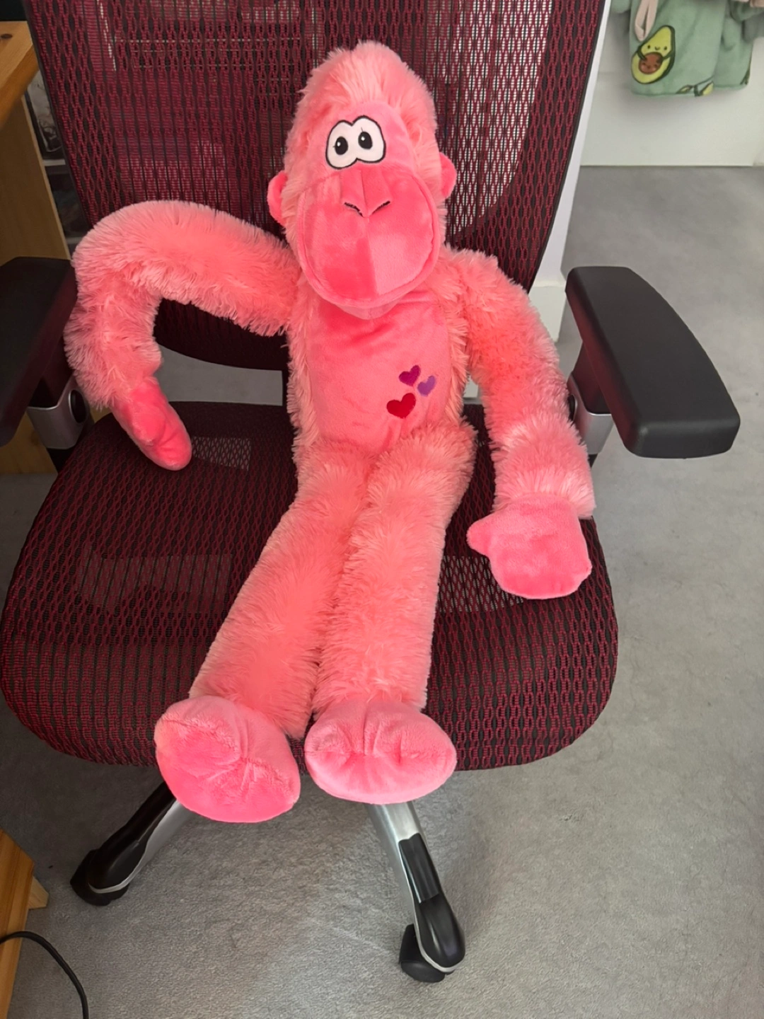 Selling a gently used pink gorilla stuffed animal. It's in great condition and super cuddly! It has a few hearts on its chest. Perfect for a child's room!