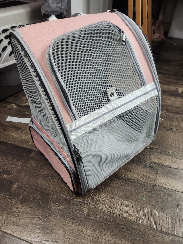 Looking to sell this pet carrier backpack! It's in great condition and perfect for taking your furry friend on adventures. The backpack is pink and grey and has a mesh window for ventilation and a small leash/strap attached to the bag. the fur pad is removable and washable. It also includes a soft pad inside for your pet's comfort. No Plastic smell