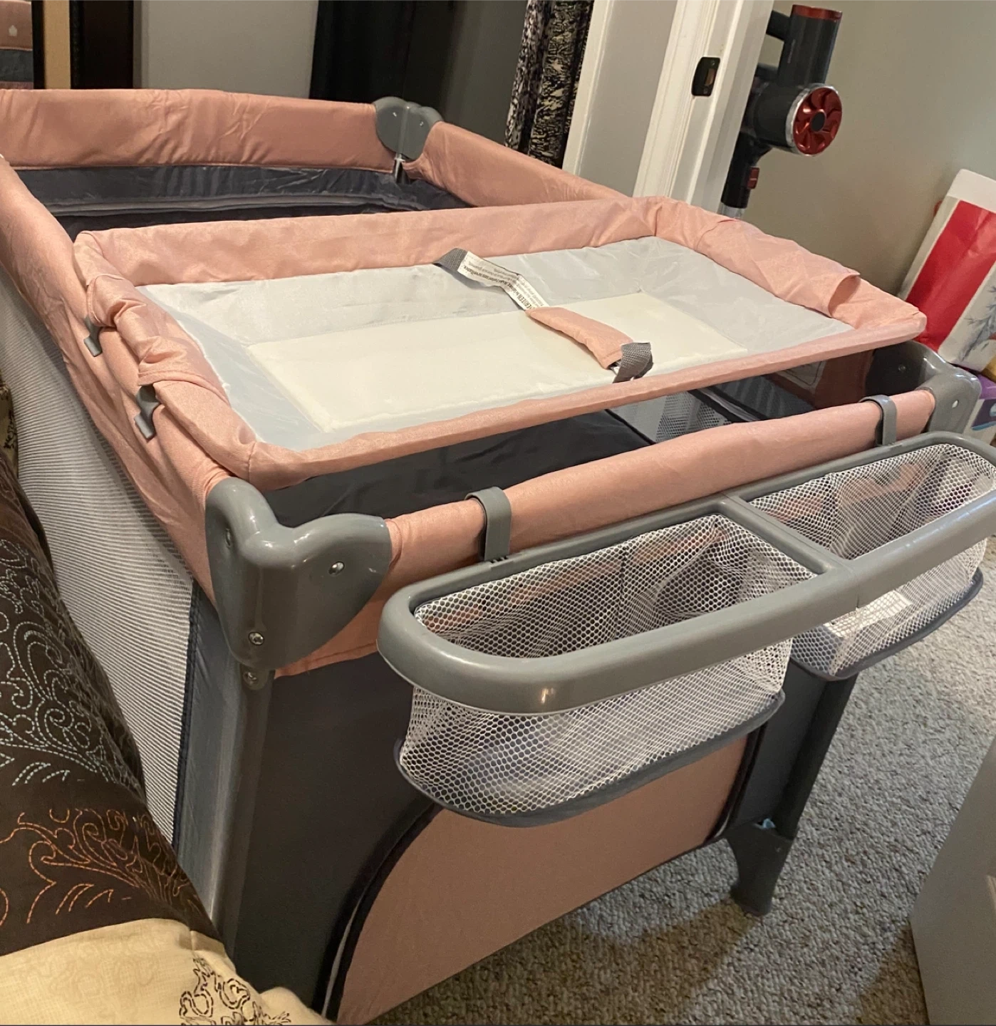 10Selling a gently used playpen in pink and grey. It's in good condition and perfect for little ones to play safely. It includes a changing table attachment and storage baskets.