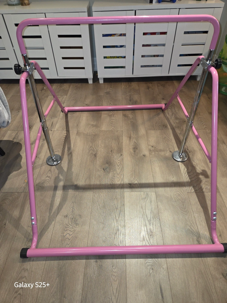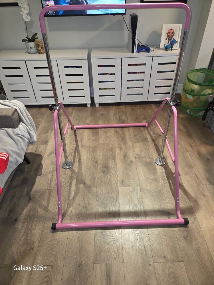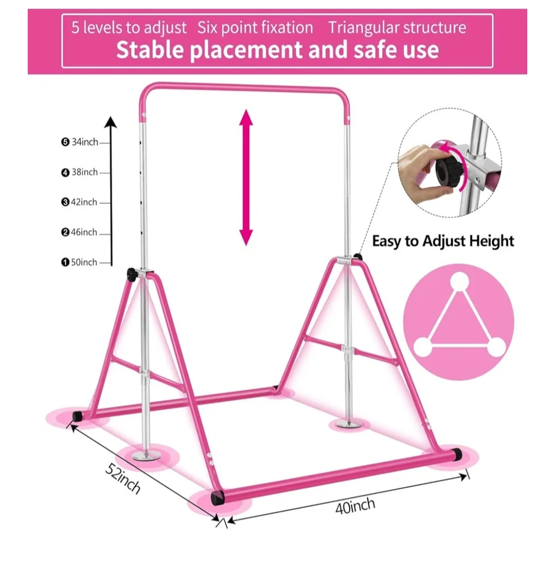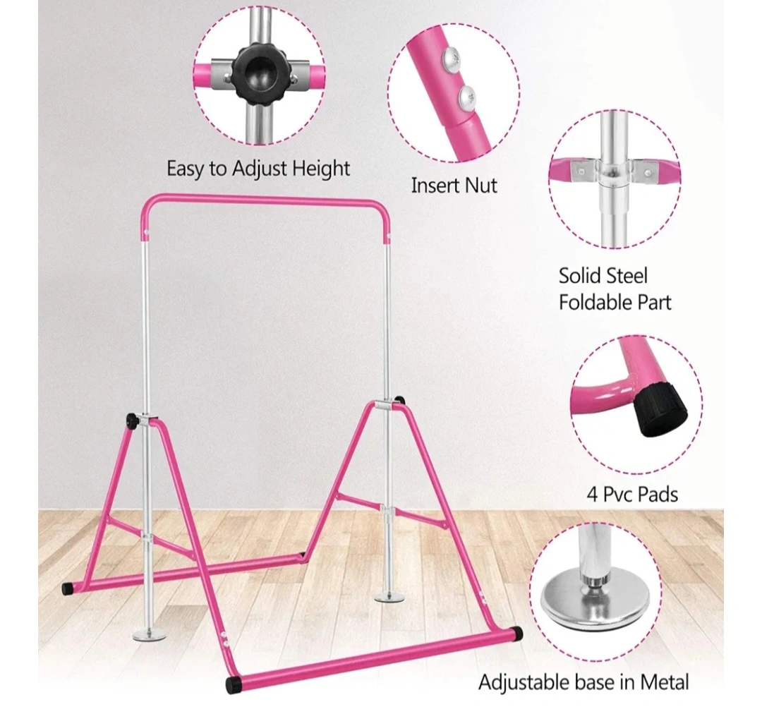 Selling a pink gymnastics bar in great condition! It's easy to adjust the height, making it perfect for growing kids. Features a solid steel foldable part and an adjustable base in metal. Also has 4 PVC pads for stability, 150lbs max weight.