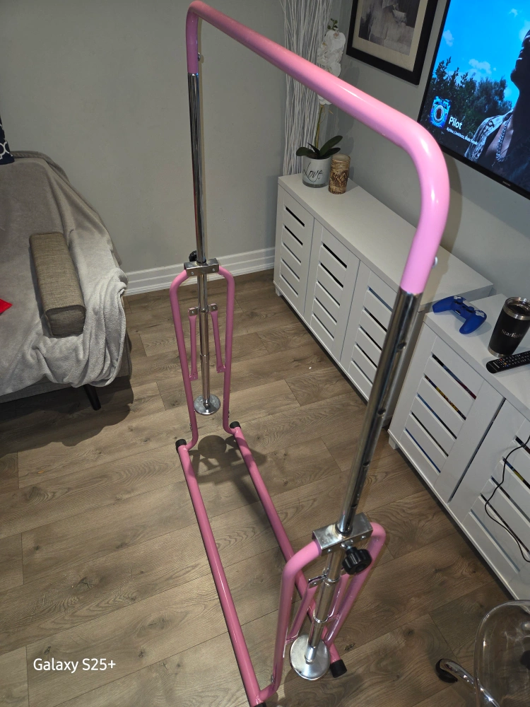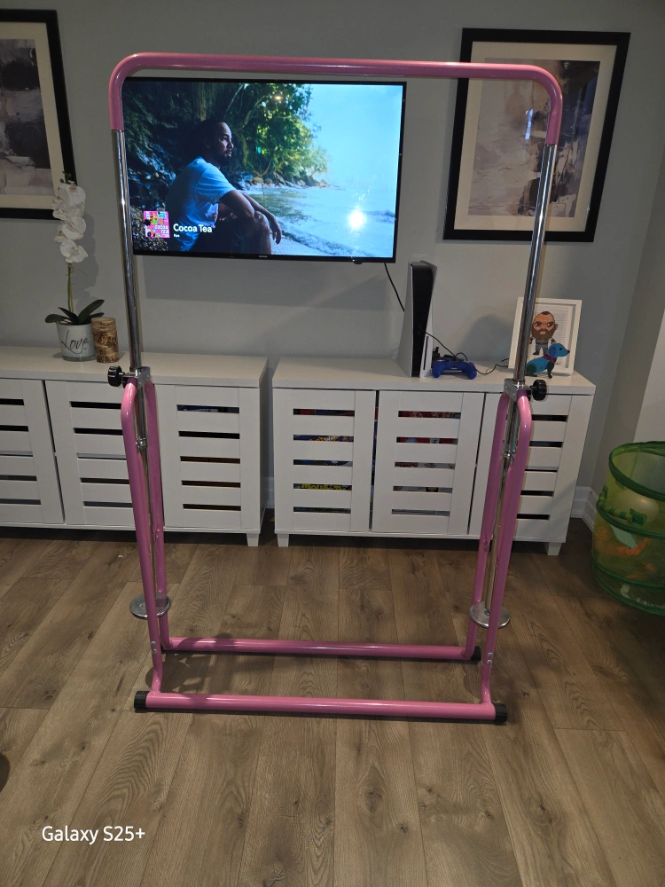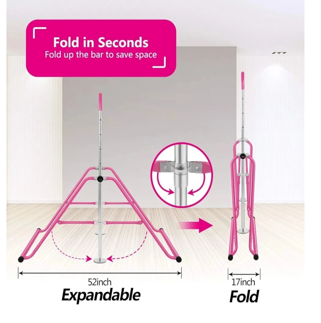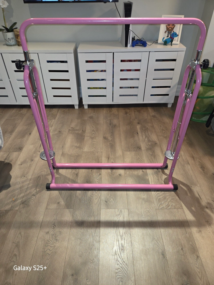 Selling a pink gymnastics bar in great condition! It's easy to adjust the height, making it perfect for growing kids. Features a solid steel foldable part and an adjustable base in metal. Also has 4 PVC pads for stability, 150lbs max weight.