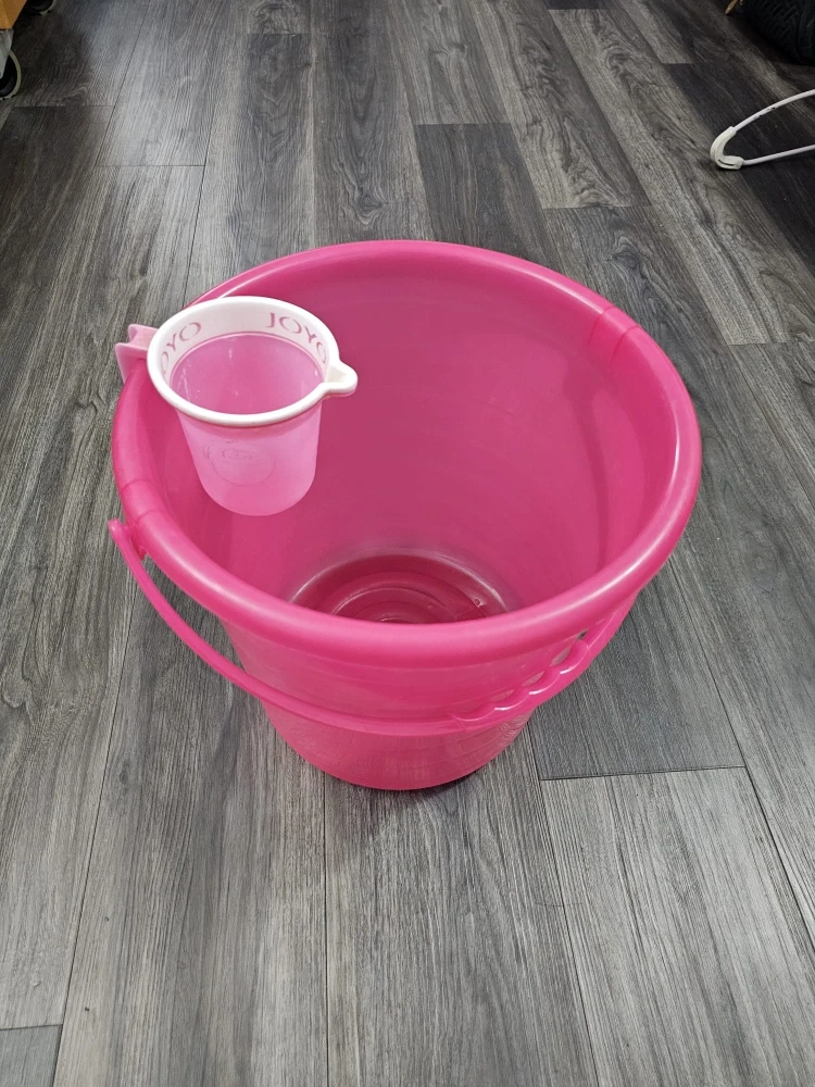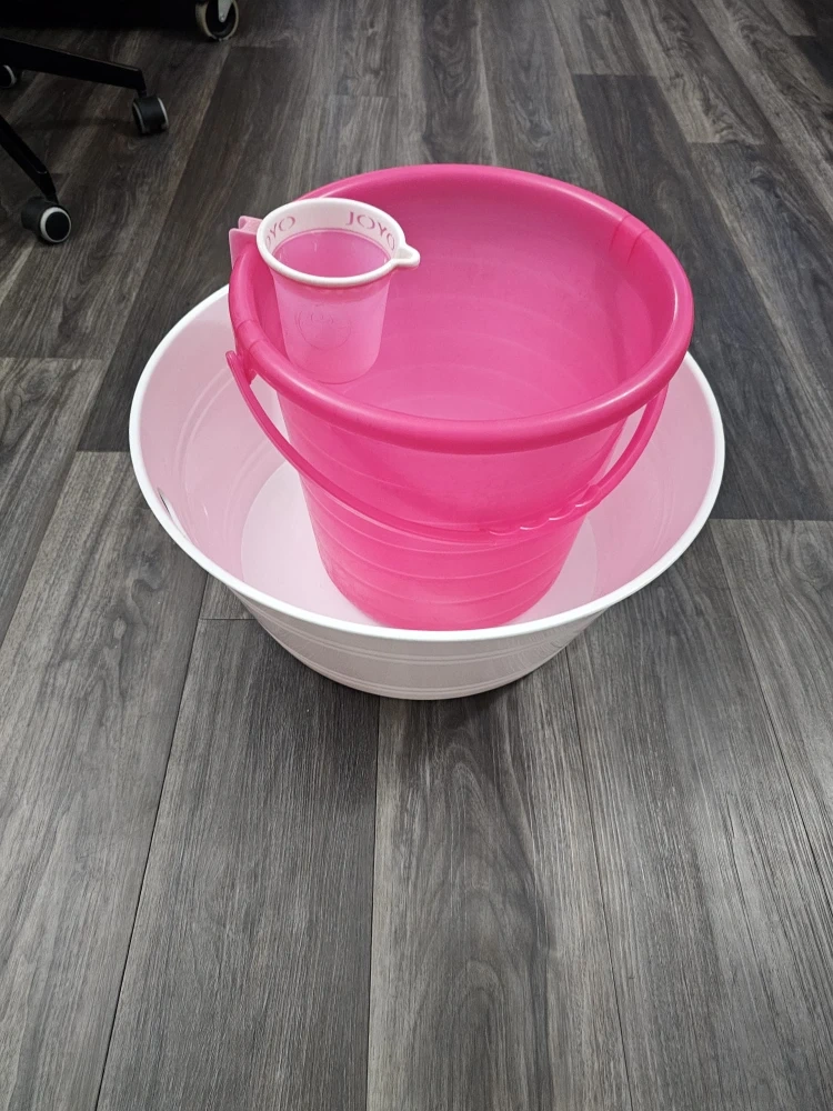 Selling a bright pink Joyo bucket, perfect for cleaning or storage! It comes with a matching dipper that clips onto the side for easy access. There's also a large white basin included, great for all sorts of tasks