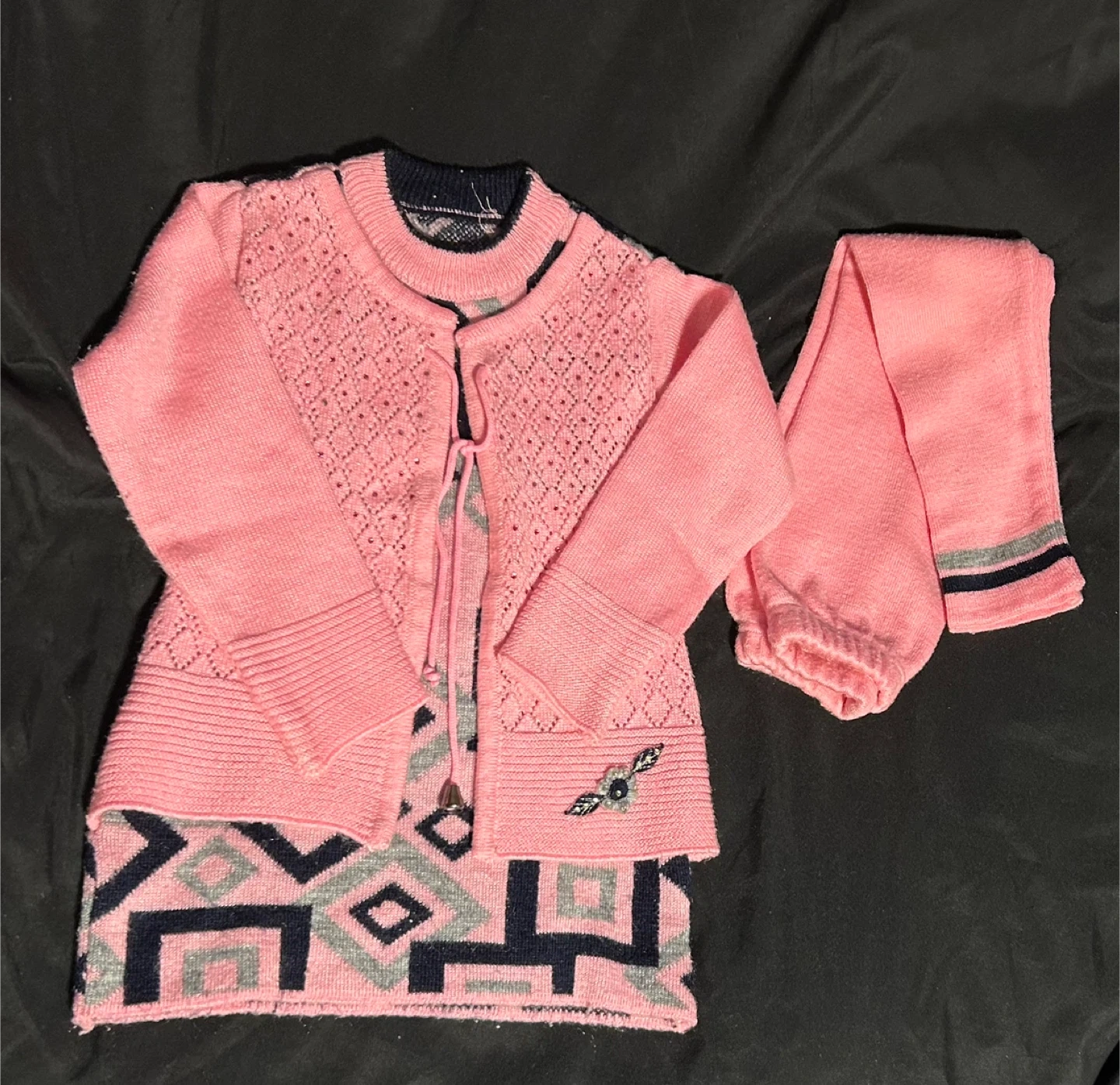 Cute pink sweater outfit for a child! It includes a sweater, top, and pants. Perfect for keeping your little one warm and stylish