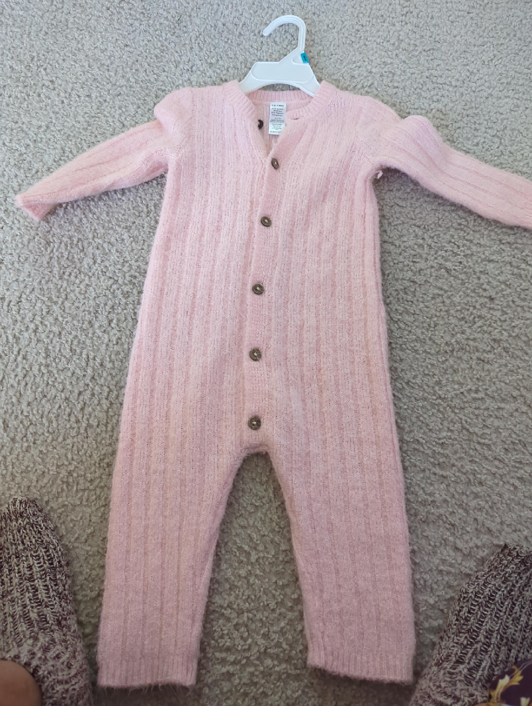 A super cute and cozy pink knit onesie for your little one! It's in excellent condition and perfect for keeping baby warm. This onesie fits babies aged 12-18 months. It features a button-up front and a soft, ribbed texture