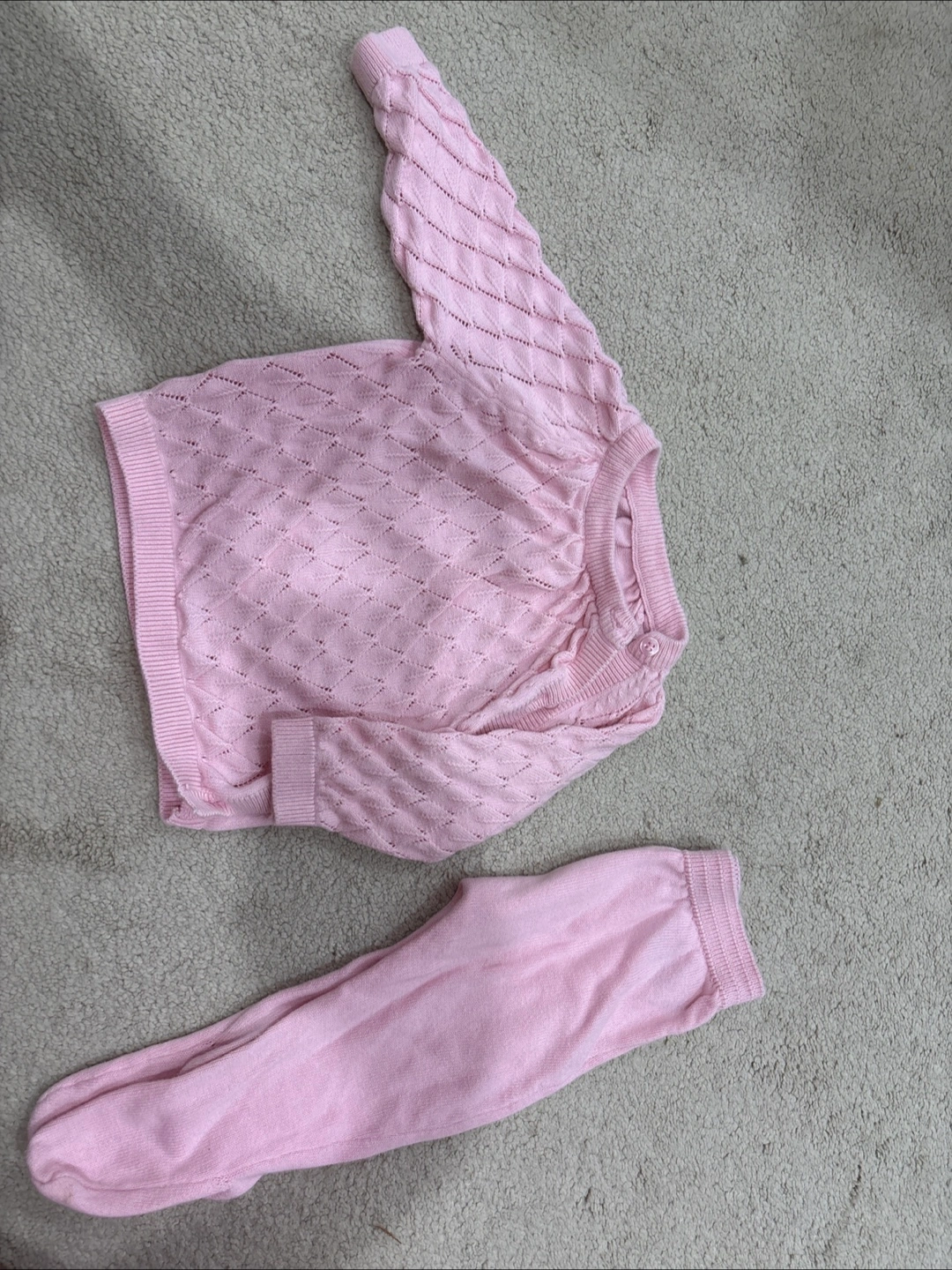 A sweet little pink knit outfit for your baby! it has a sweater and thigh pants, perfect for keeping your little one cozy and cute
