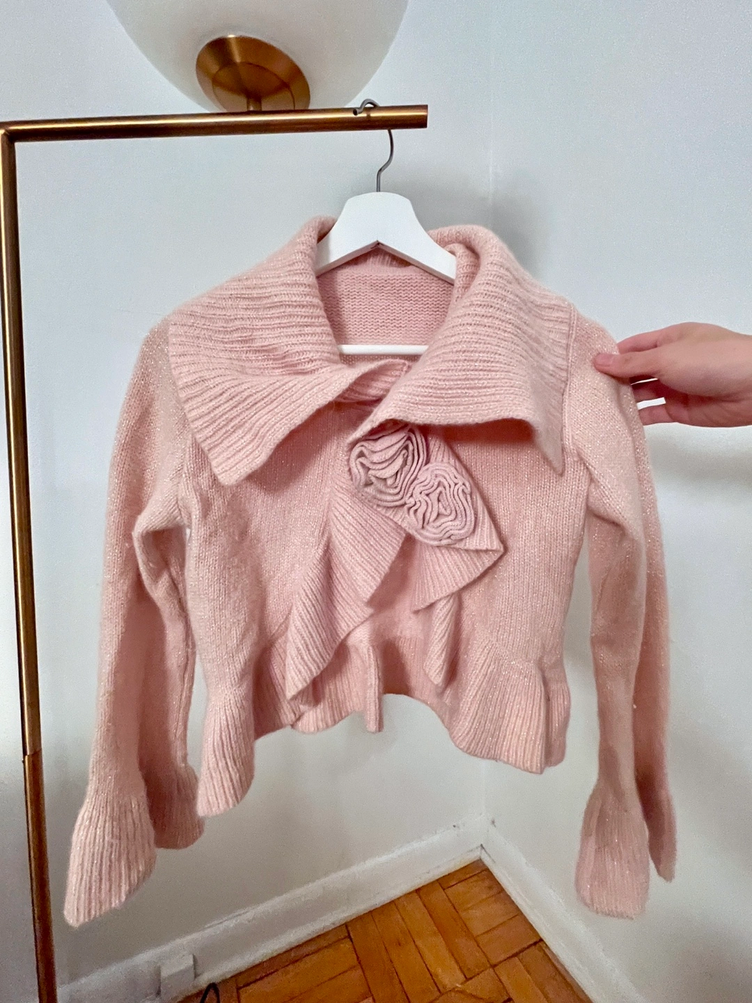 106A lovely pink knit cardigan featuring a unique ruffle detail and a wide collar. Perfect for adding a touch of elegance to any outfit. It's in great condition and ready for a new home!