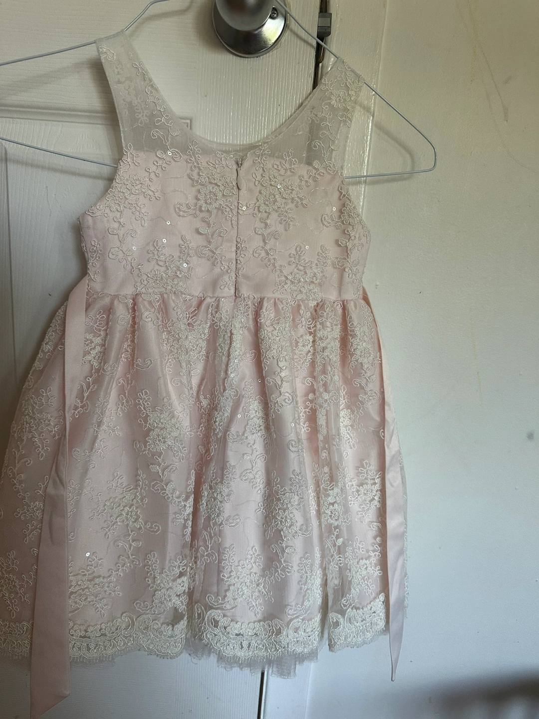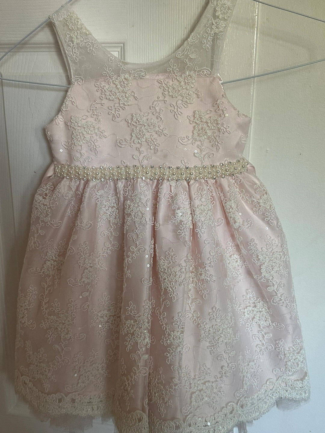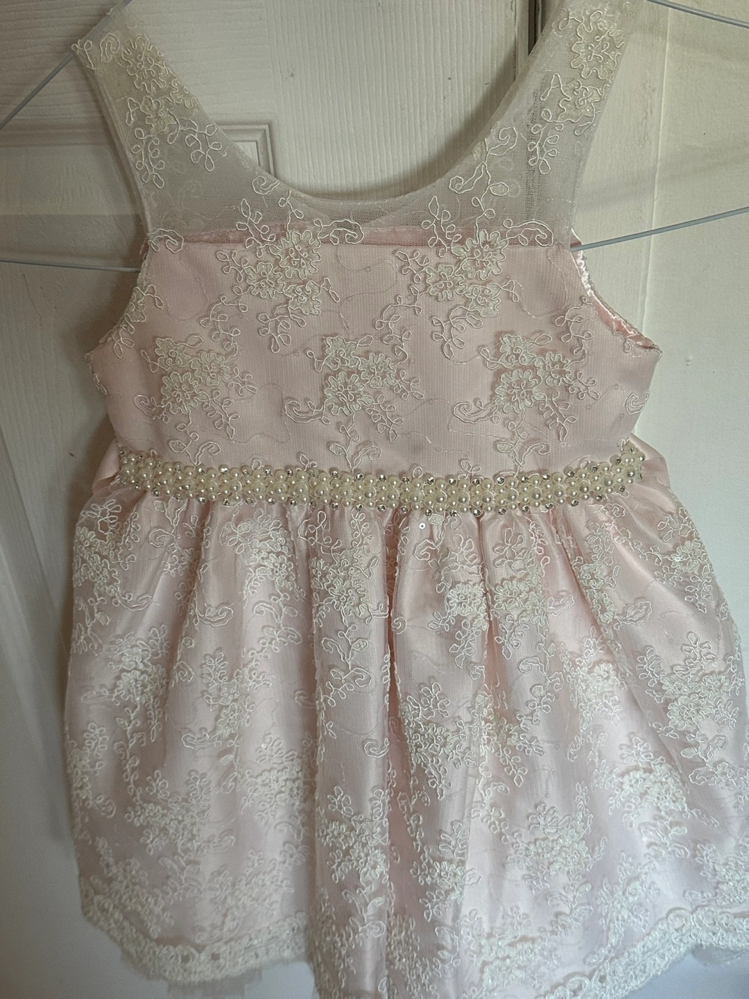 A beautiful pink dress with delicate white lace detailing! It features a pearl-like beaded waistline and a sweet, classic design. Perfect for a special occasion or just feeling fancy!