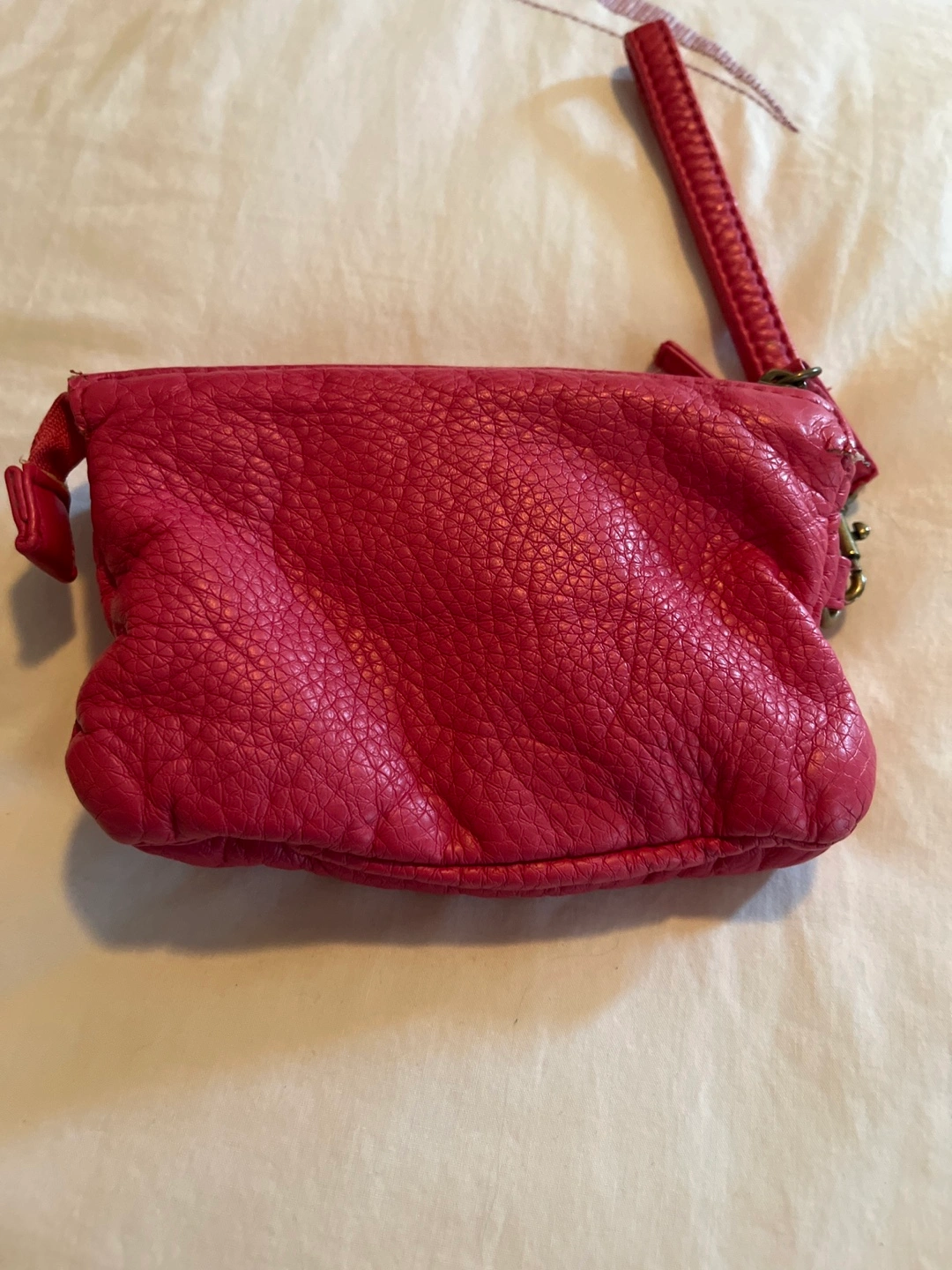 Selling a cute pink leather wristlet! It's in good condition and perfect for carrying your essentials. The wristlet features a zippered closure and a convenient wrist strap