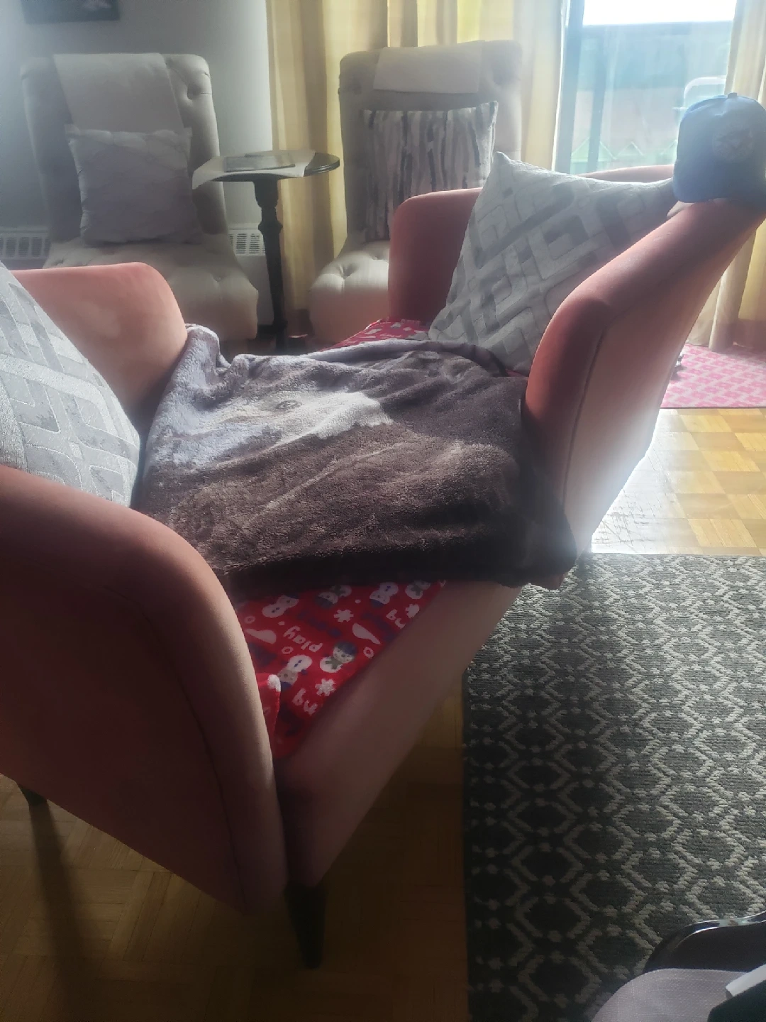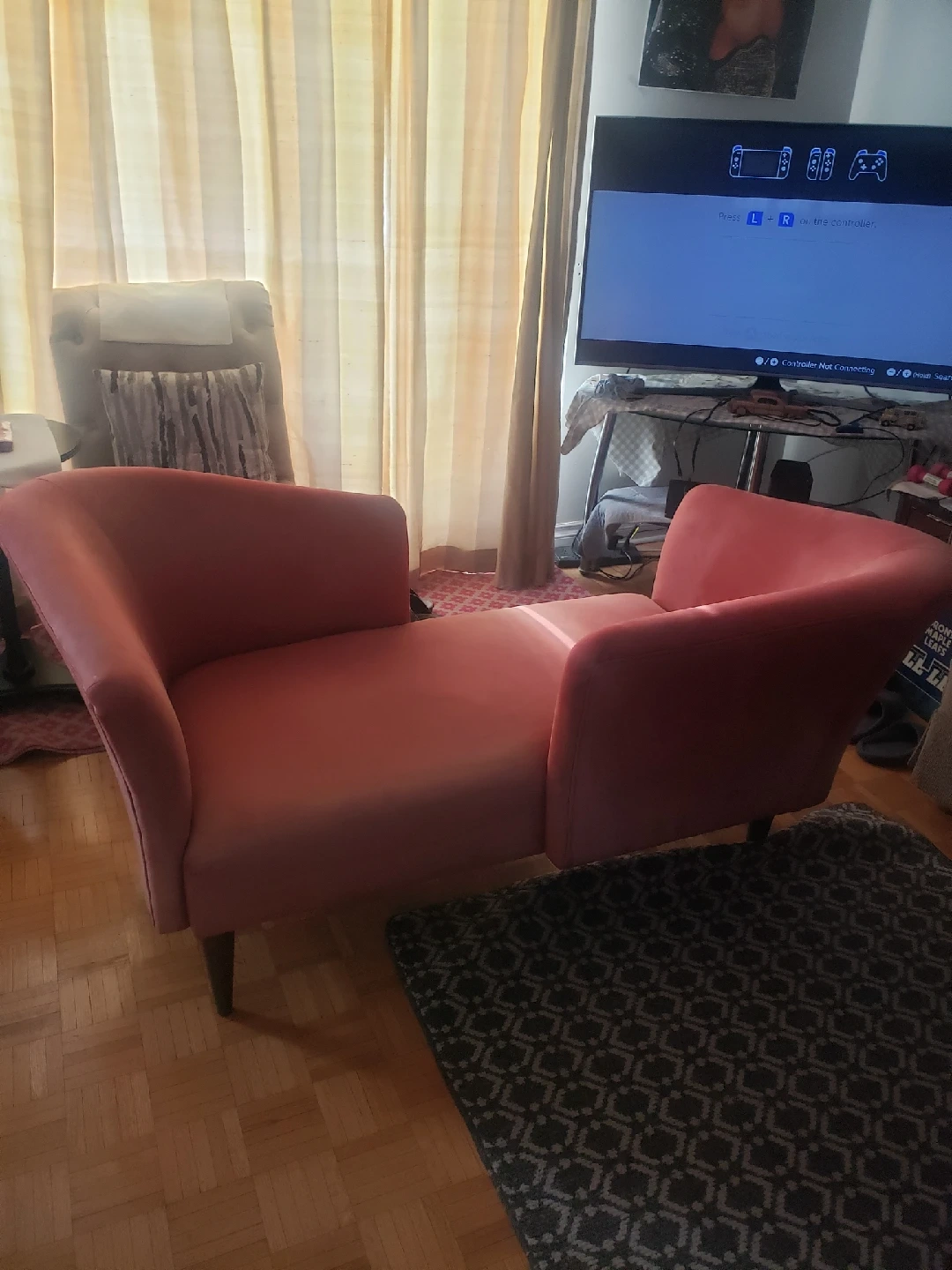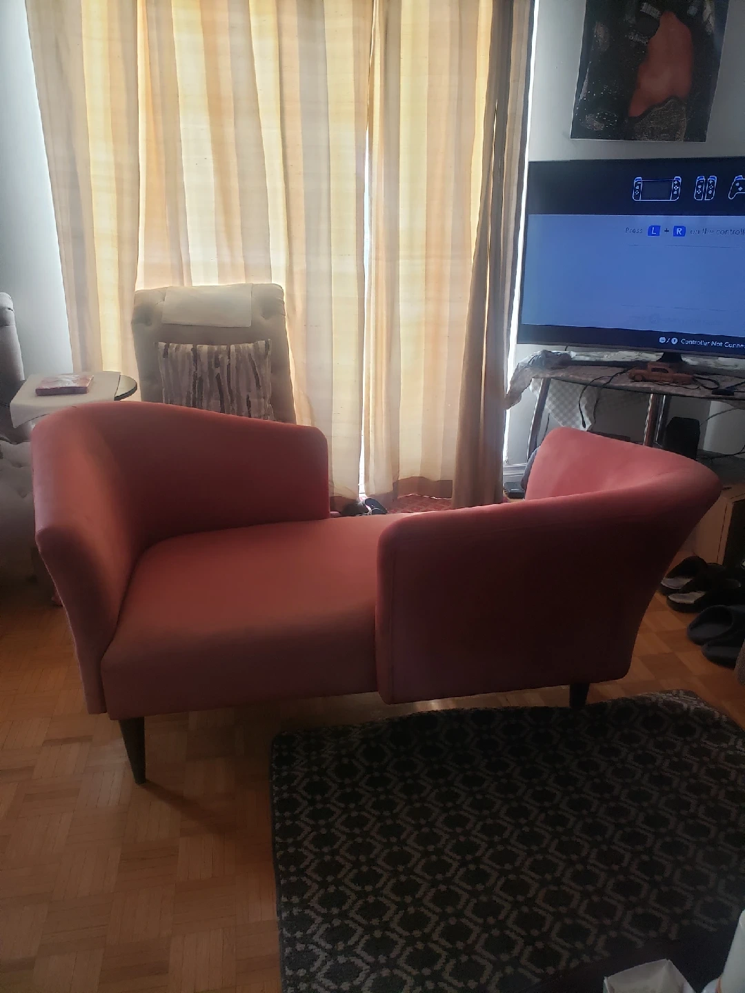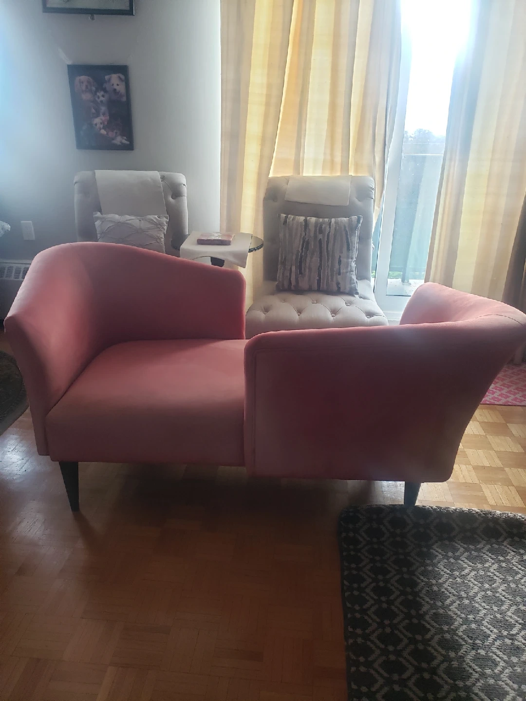 53Selling a cute pink loveseat sofa! It's in great condition and would be perfect for a small space or apartment. The colour is a lovely soft pink, and it's super comfy for lounging, smoke free and pet friendly !