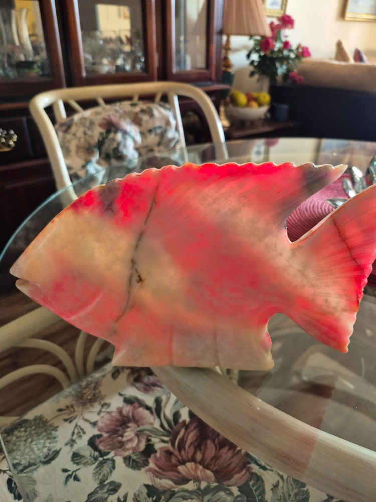 A beautiful pink marble fish sculpture, perfect for adding a touch of whimsy to your home decor.genuine onyx.