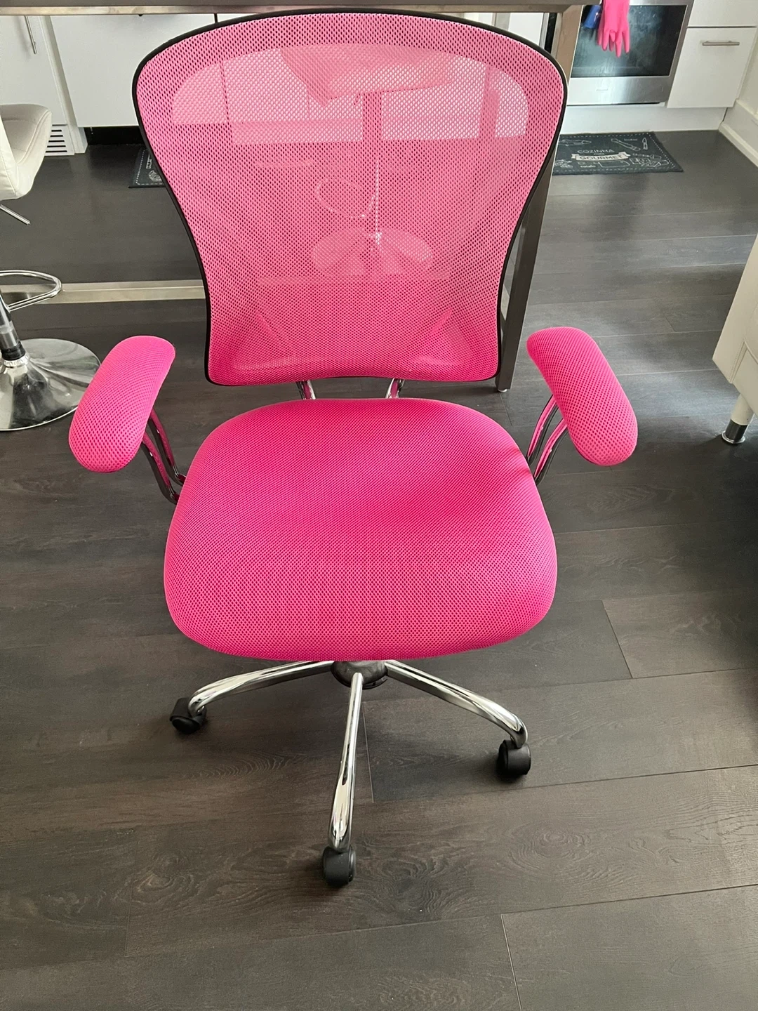 10Selling a vibrant pink mesh office chair! It's in great shape and ready to brighten up your workspace or home office. The mesh back provides good ventilation, and the adjustable height makes it a comfortable fit for different users. The chair also features armrests for added support during long work sessions