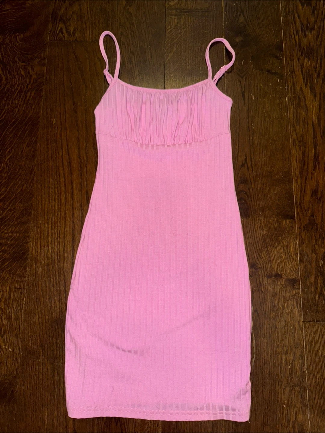 Selling a cute pink mini dress! It has a ribbed texture and a gathered detail at the bust. Never worn.