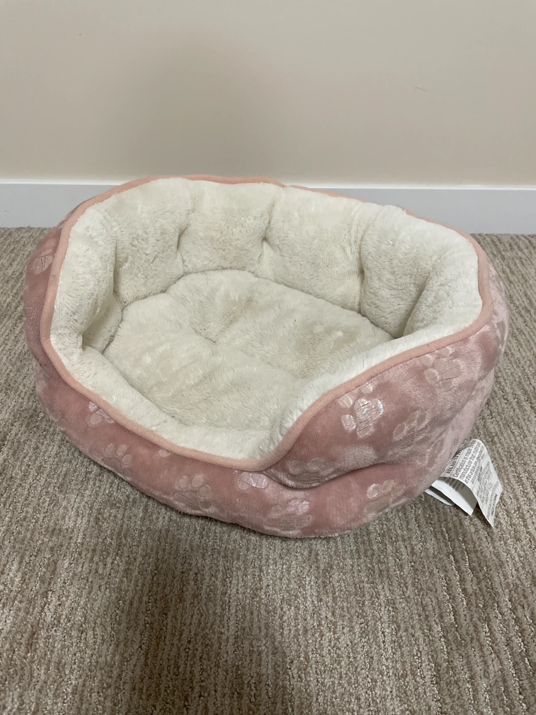 29A cozy pet bed with a cute pink paw print design! It has a soft, plush interior that your furry friend will love. The bed also features a durable exterior and a non-slip bottom. Perfect for cats or small dogs!