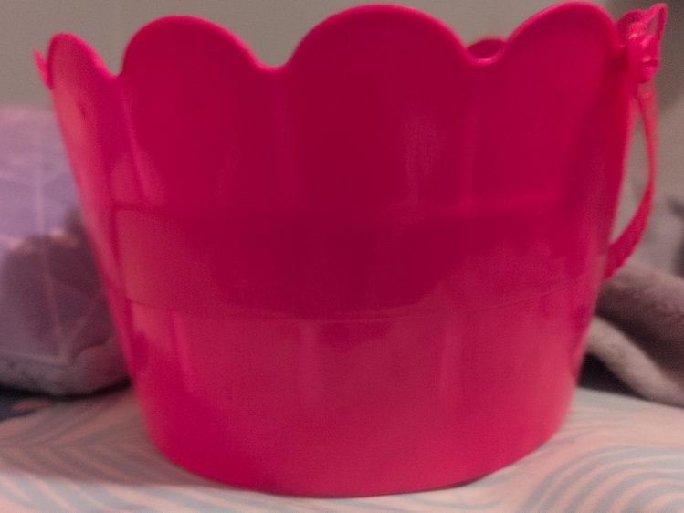 24Here's a cute pink plastic bucket, perfect for kids playing in the sand or for organizing small items!