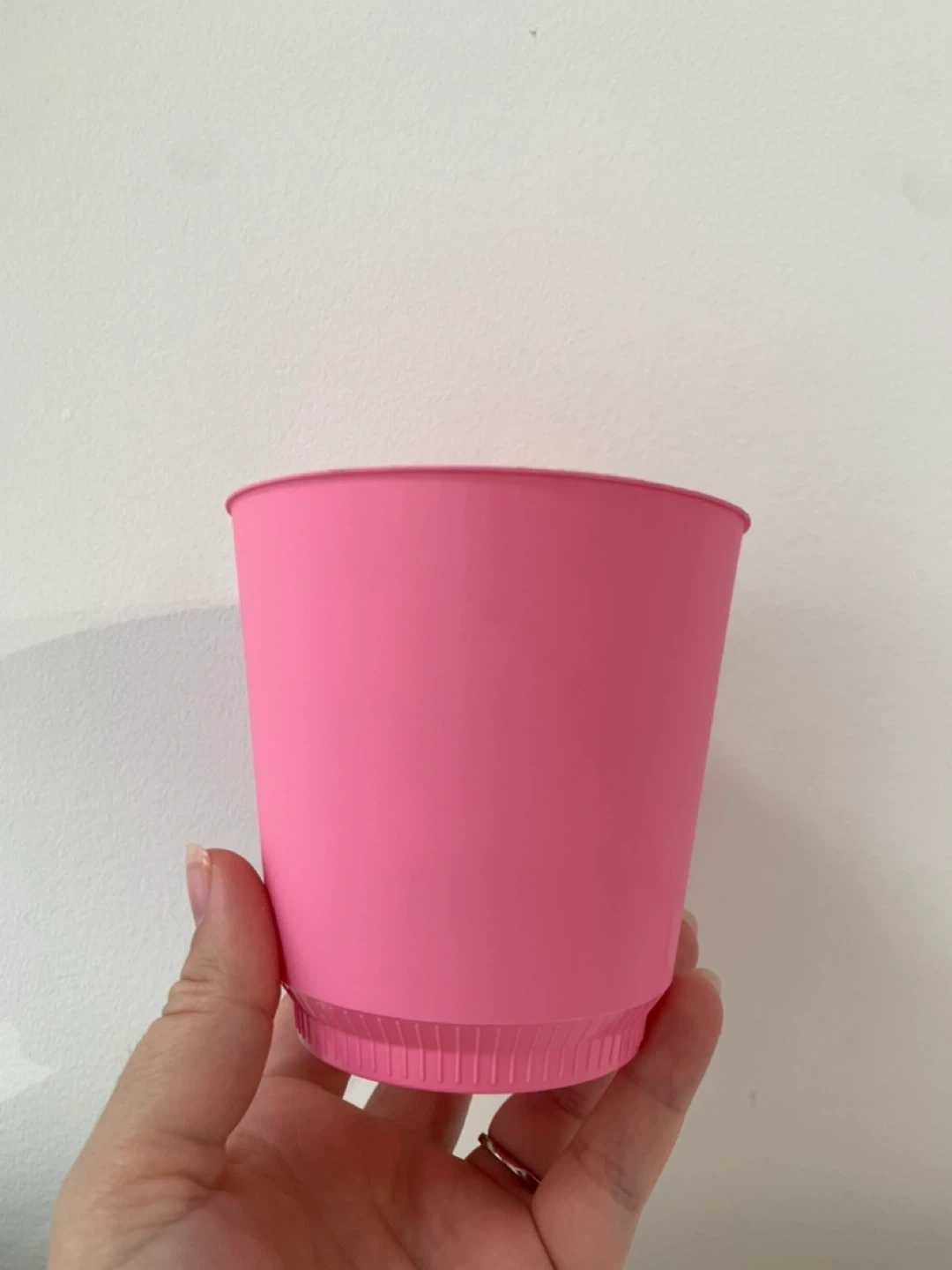 A pink plastic planter to hold a plant or flowers