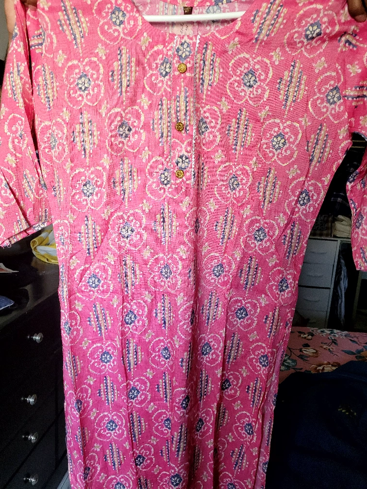 Selling a beautiful pink printed Kurti! It measures approximately 22 inches across the chest and 39 inches in length. Perfect for adding a pop of colour to your wardrobe!