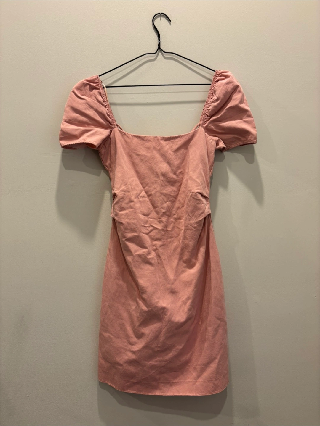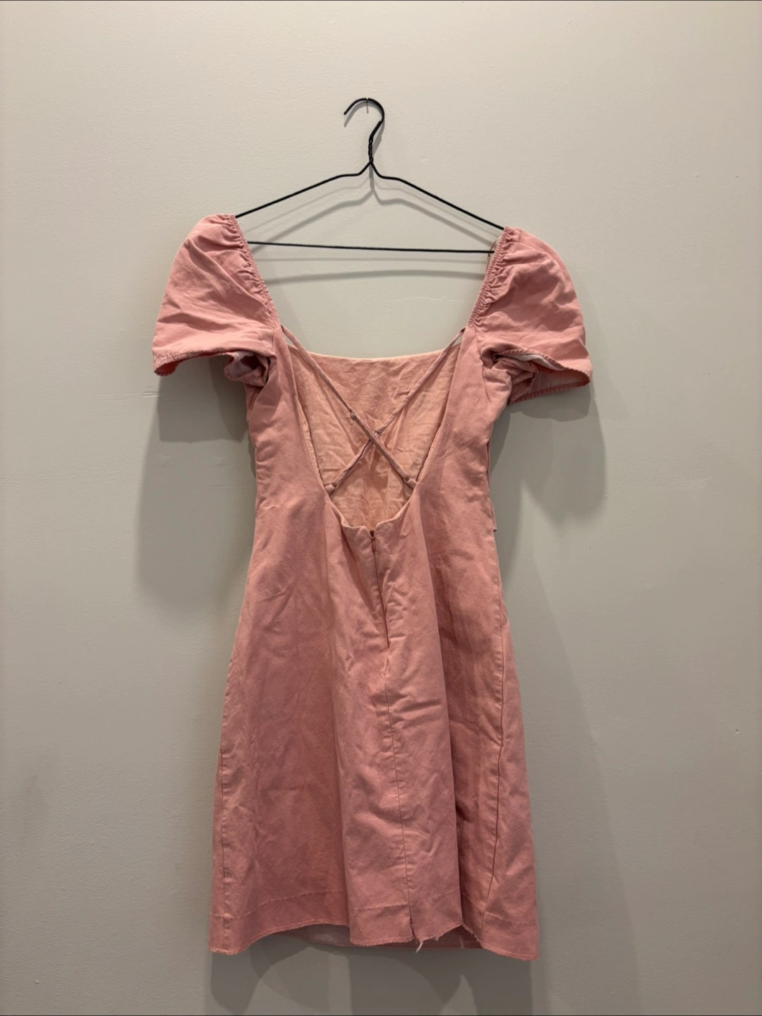Adorable pink mini dress. Puff sleeves and a square neckline. Cross back detail. Perfect for a summer occasion. Too tight for me. Pick up near college and spadina