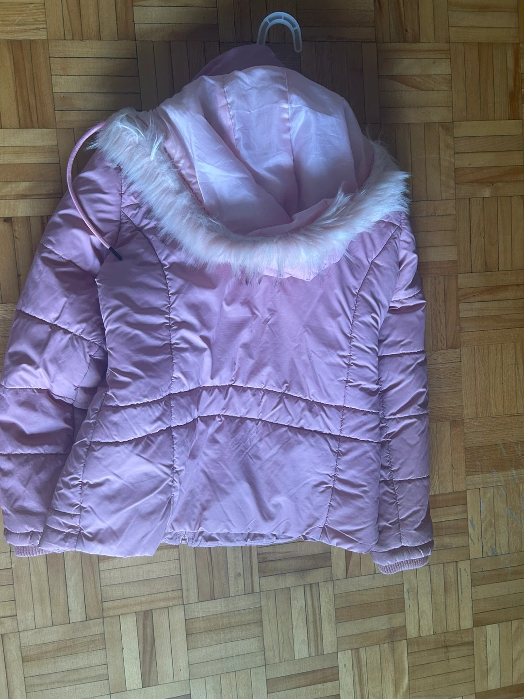 Selling a cute pink puffer jacket! It features a faux fur hood to keep you extra cozy. It's in great condition and perfect for chilly days. The jacket has a zipper and pockets on the front Size -small -medium