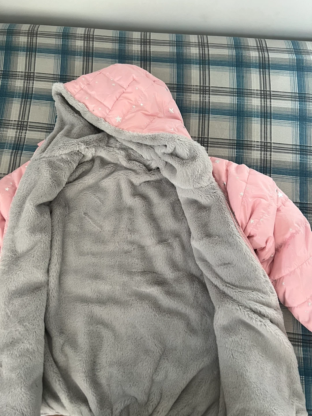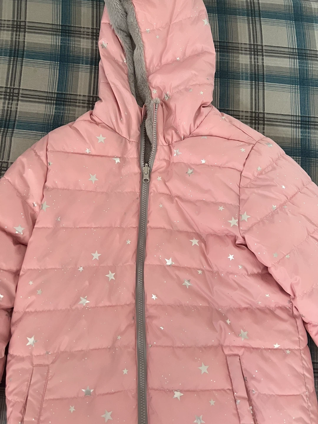 10A cute pink puffer jacket perfect for keeping your little one warm! It features a soft, grey plush lining and a hood for extra coziness. The jacket is adorned with a subtle star pattern, adding a touch of fun to any outfit