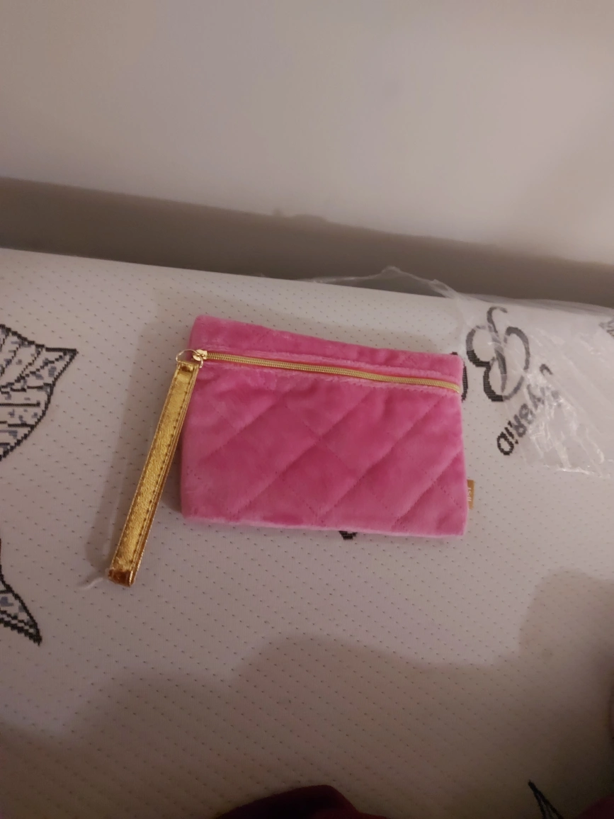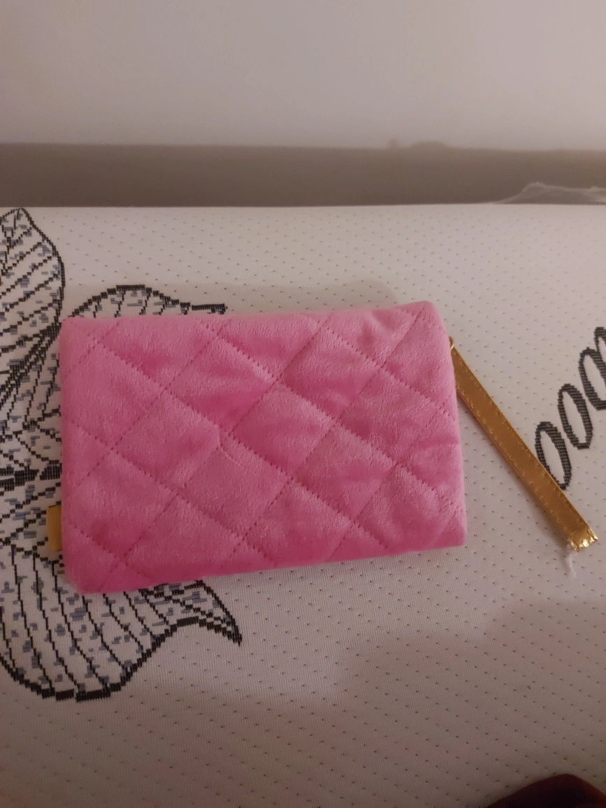 I am selling this soft pink clutch. The exterior has a diamond pattern. It also has a gold-toned zipper and wrist strap, and a small label on the side. Carrying this clutch can create a feeling of tranquility.