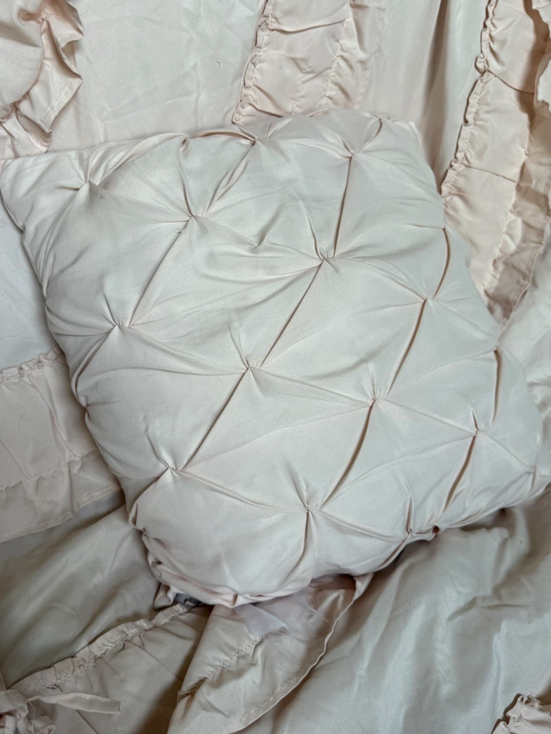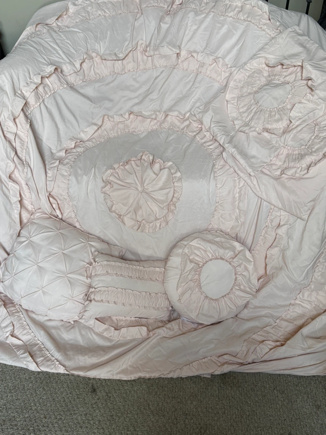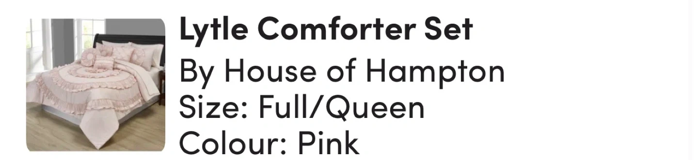 Selling a lovely pink bedding set with ruffle detailing! Includes a comforter, two shams and three decorative pillows. Double/Full size. Originally from Wayfair (posting in pics). It's in great condition and would add a touch of elegance to any bedroom.
