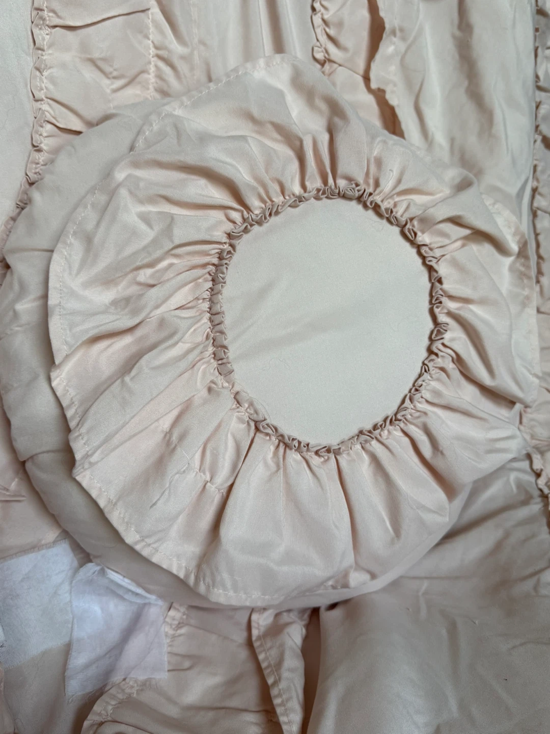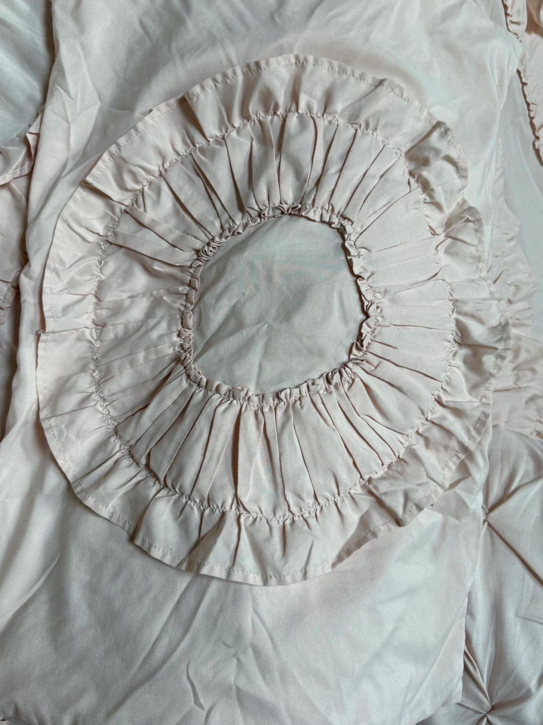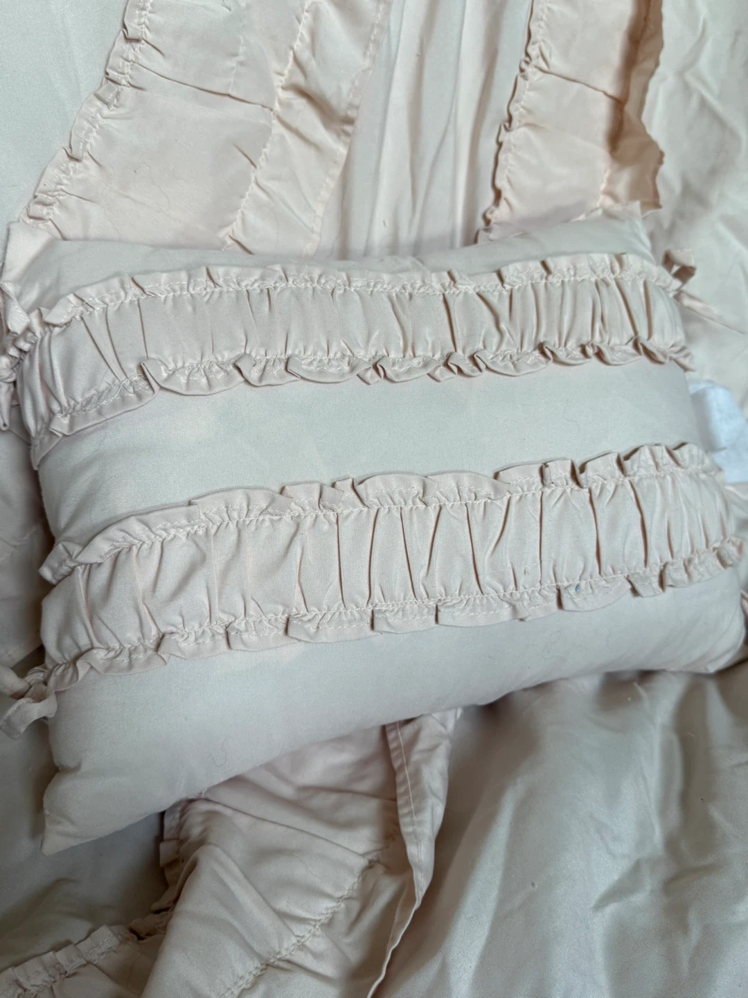 Selling a lovely pink bedding set with ruffle detailing! Includes a comforter, two shams and three decorative pillows. Double/Full size. Originally from Wayfair (posting in pics). It's in great condition and would add a touch of elegance to any bedroom.